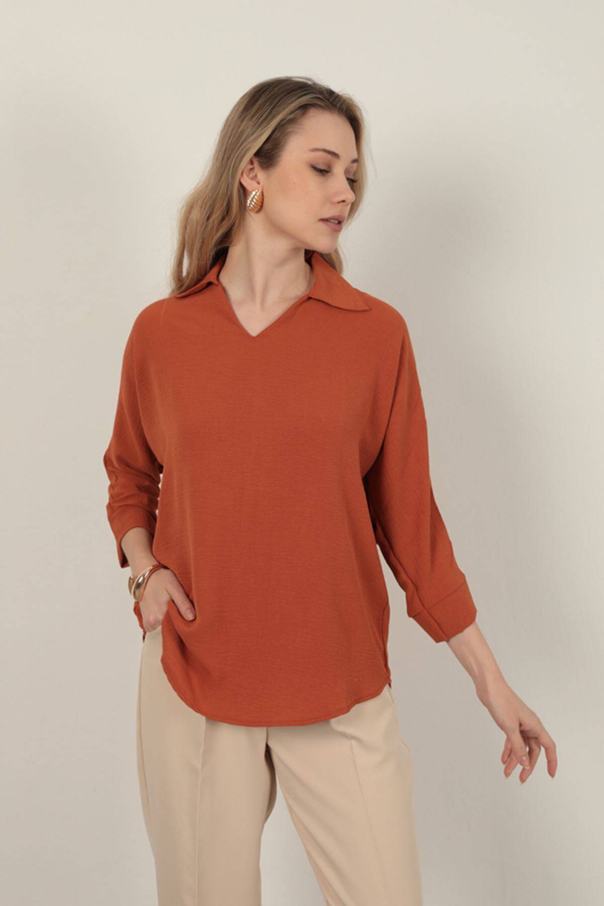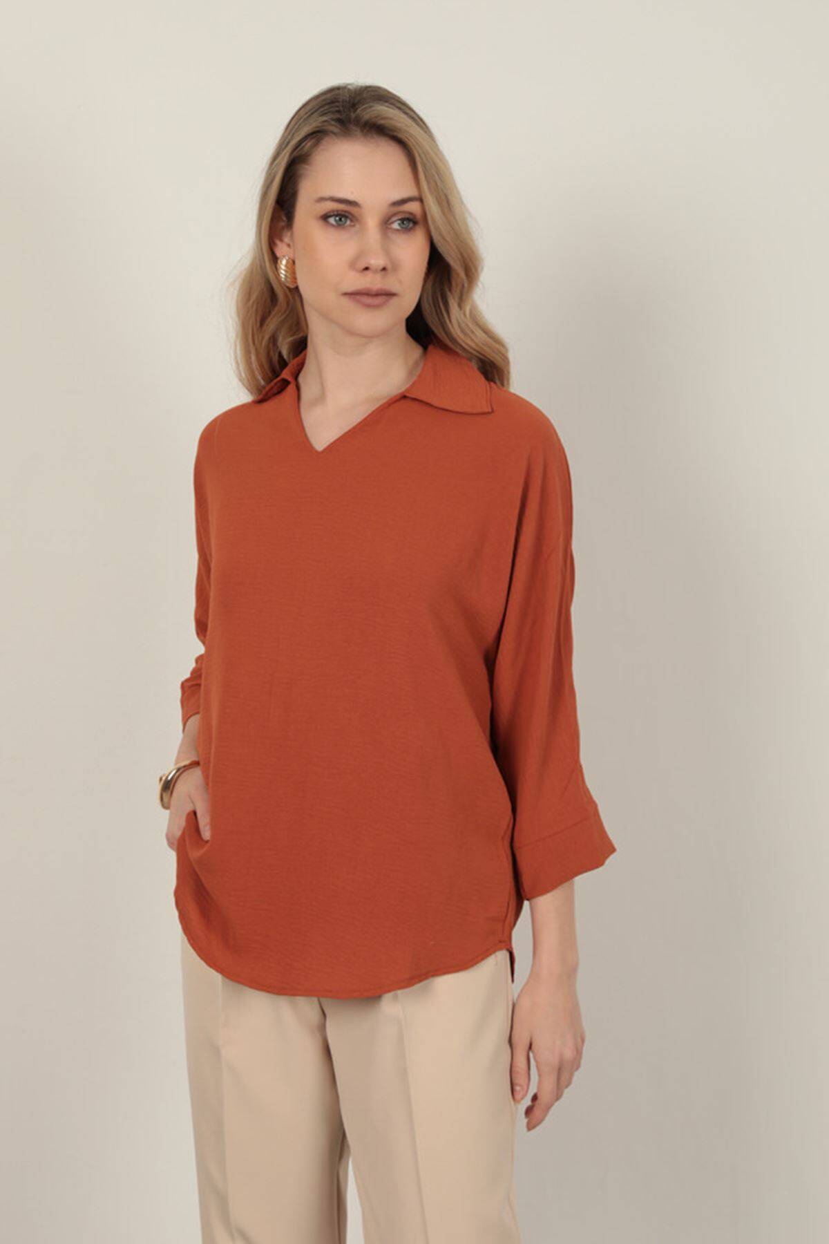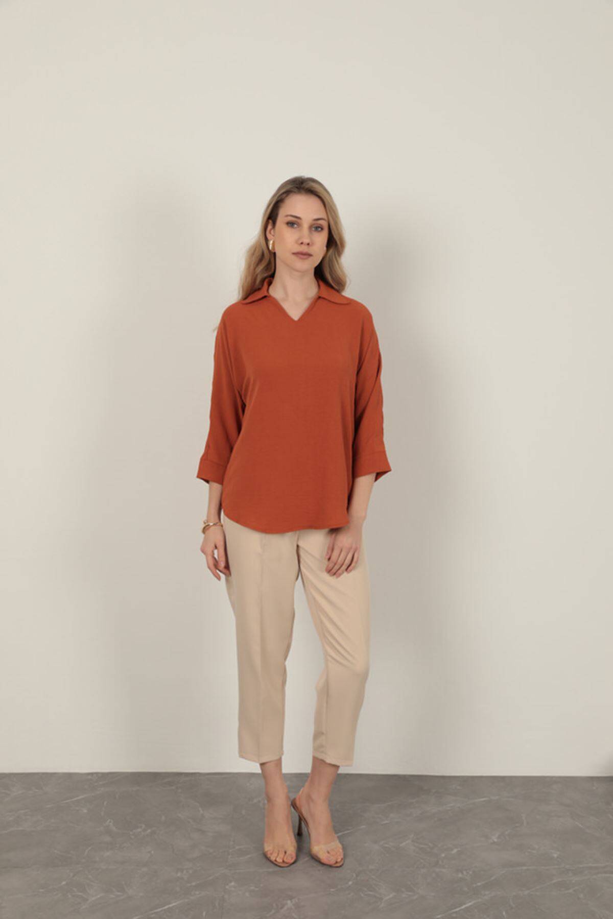 Aerobin Kumaş V Gömlek Yaka Kadın Gömlek-Kiremit