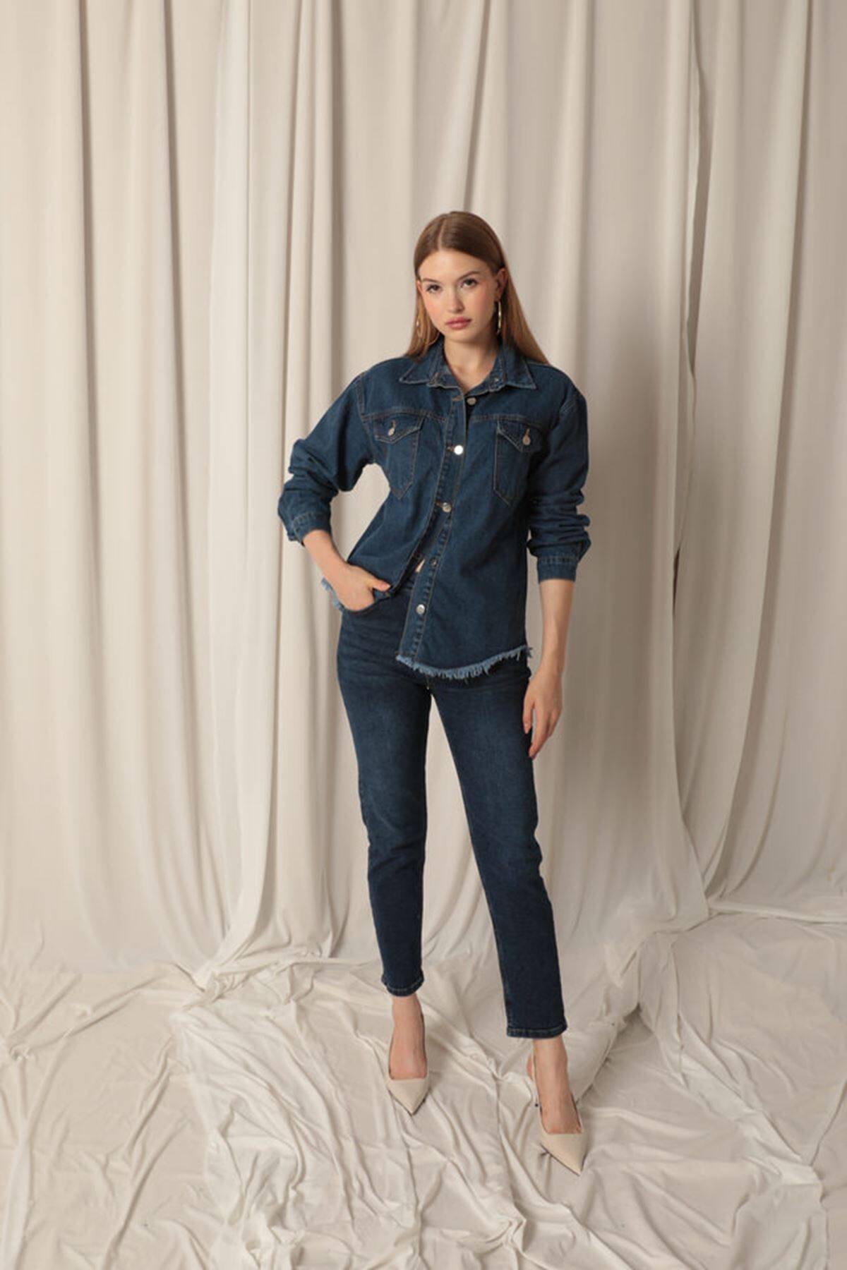 Denim Kumaş Cep Detay Püsküllü Kadın Mavi Kot Ceket