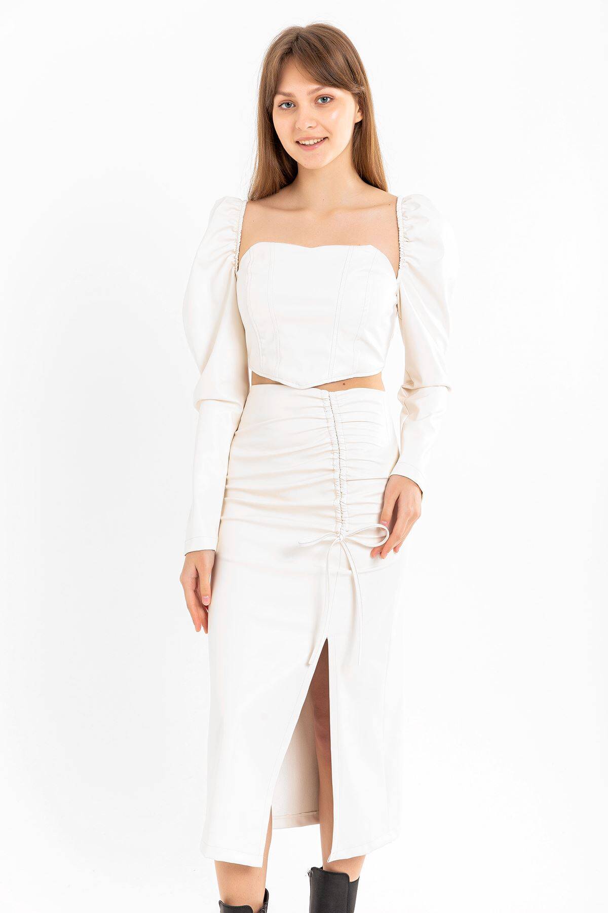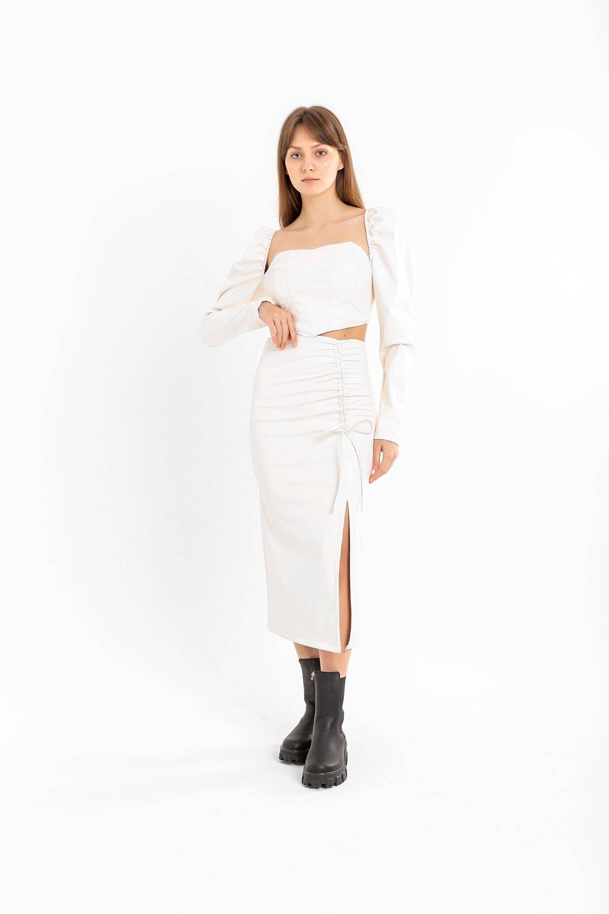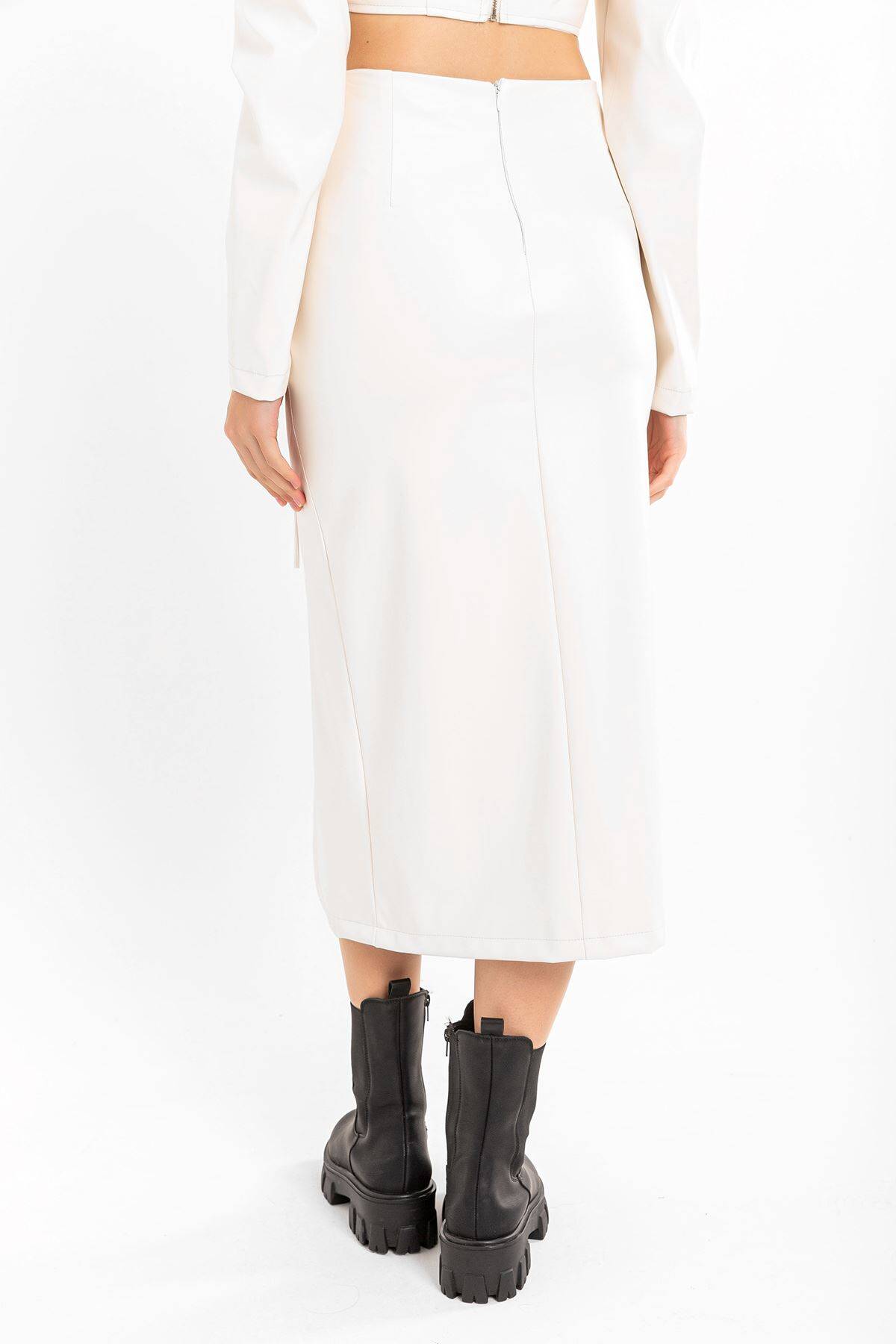 | Ürün Adı | Deri Kumaş Diz Altı Boy Yırtmaçlı Büzgü Detaylı Kadın Etek |