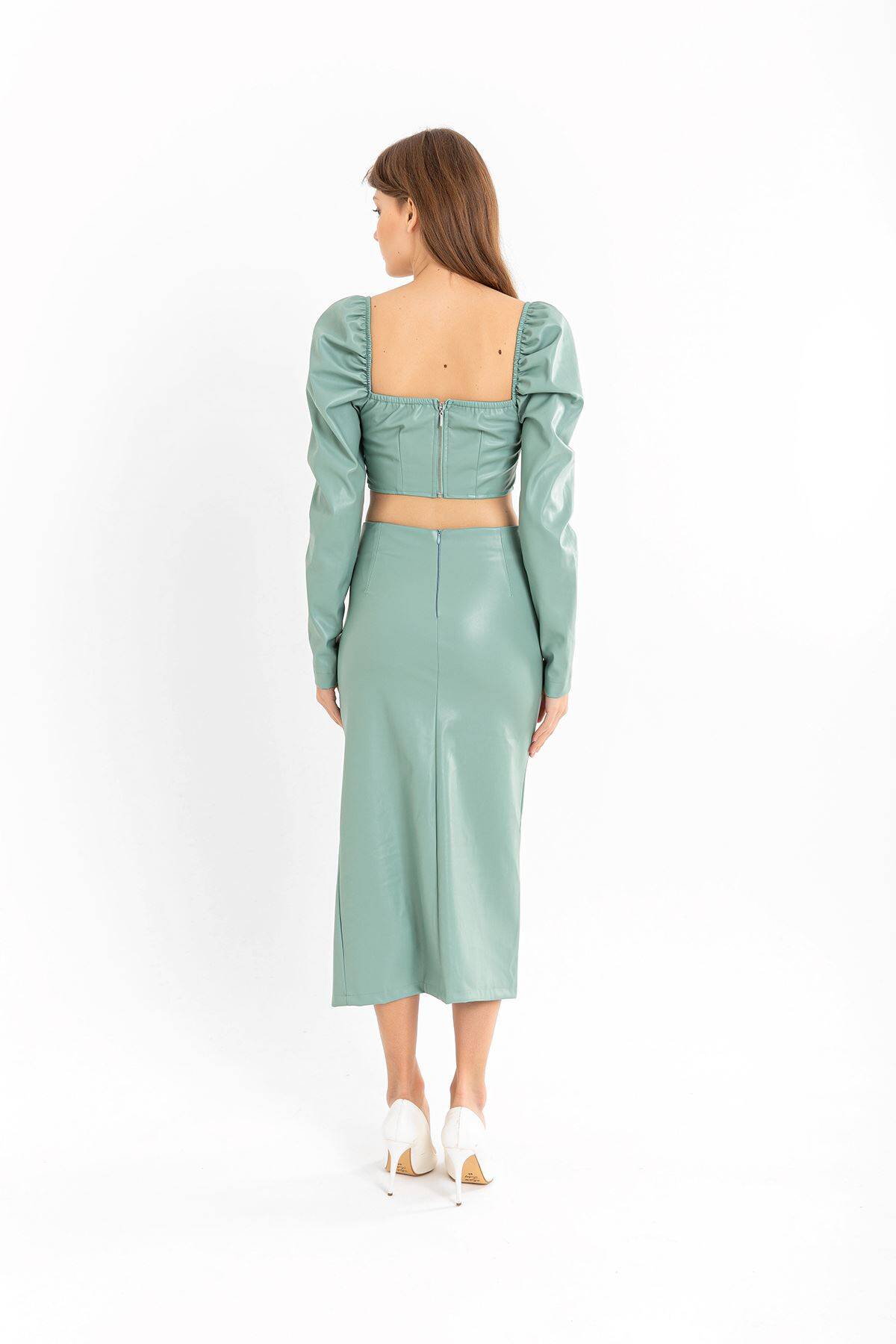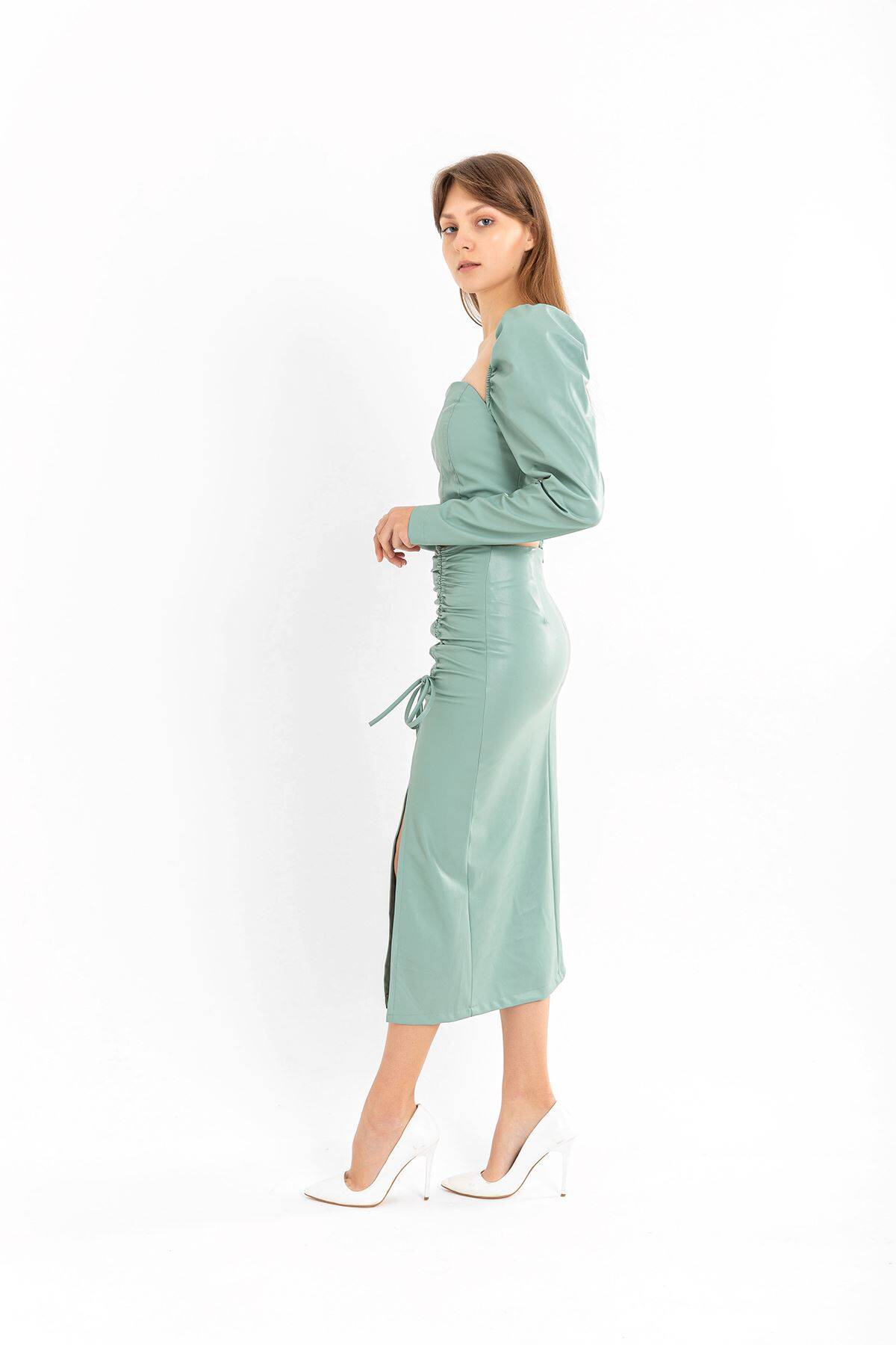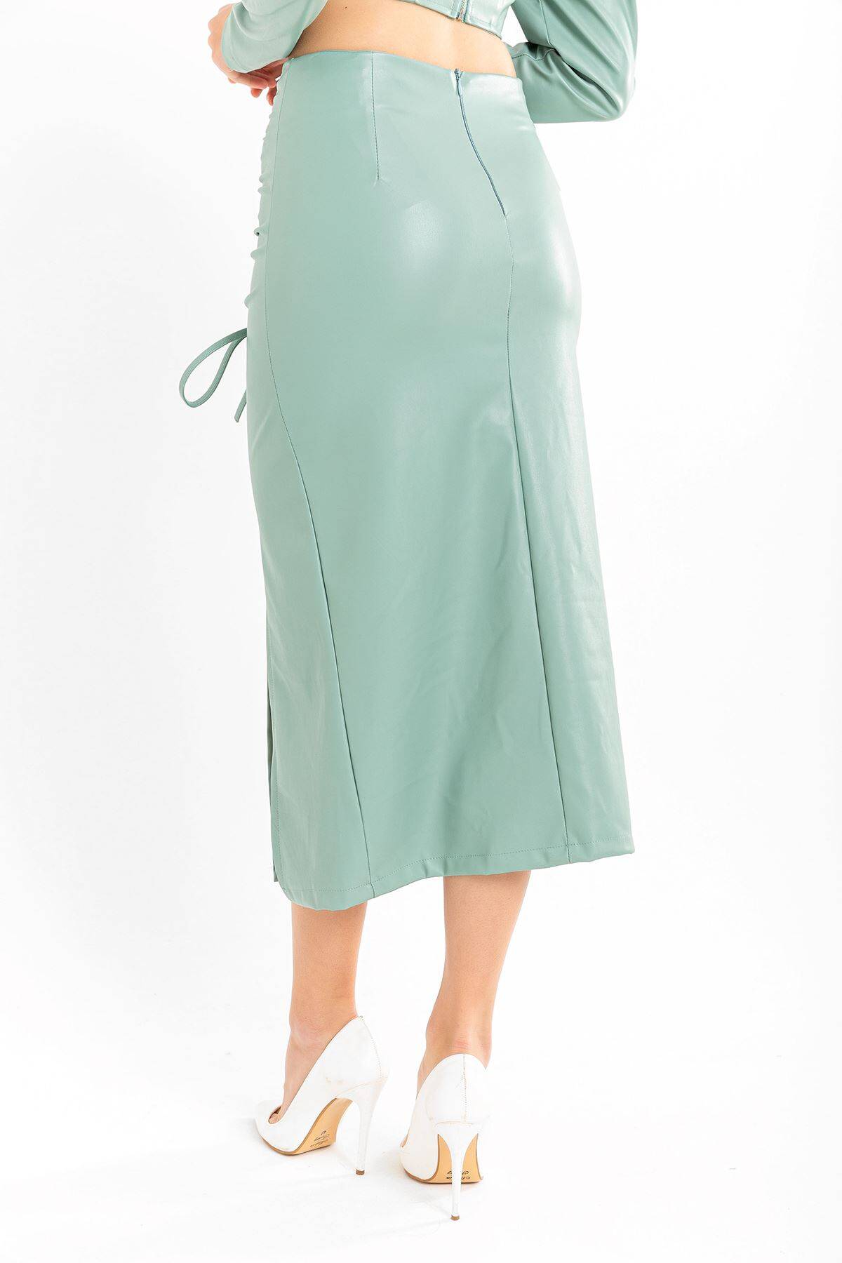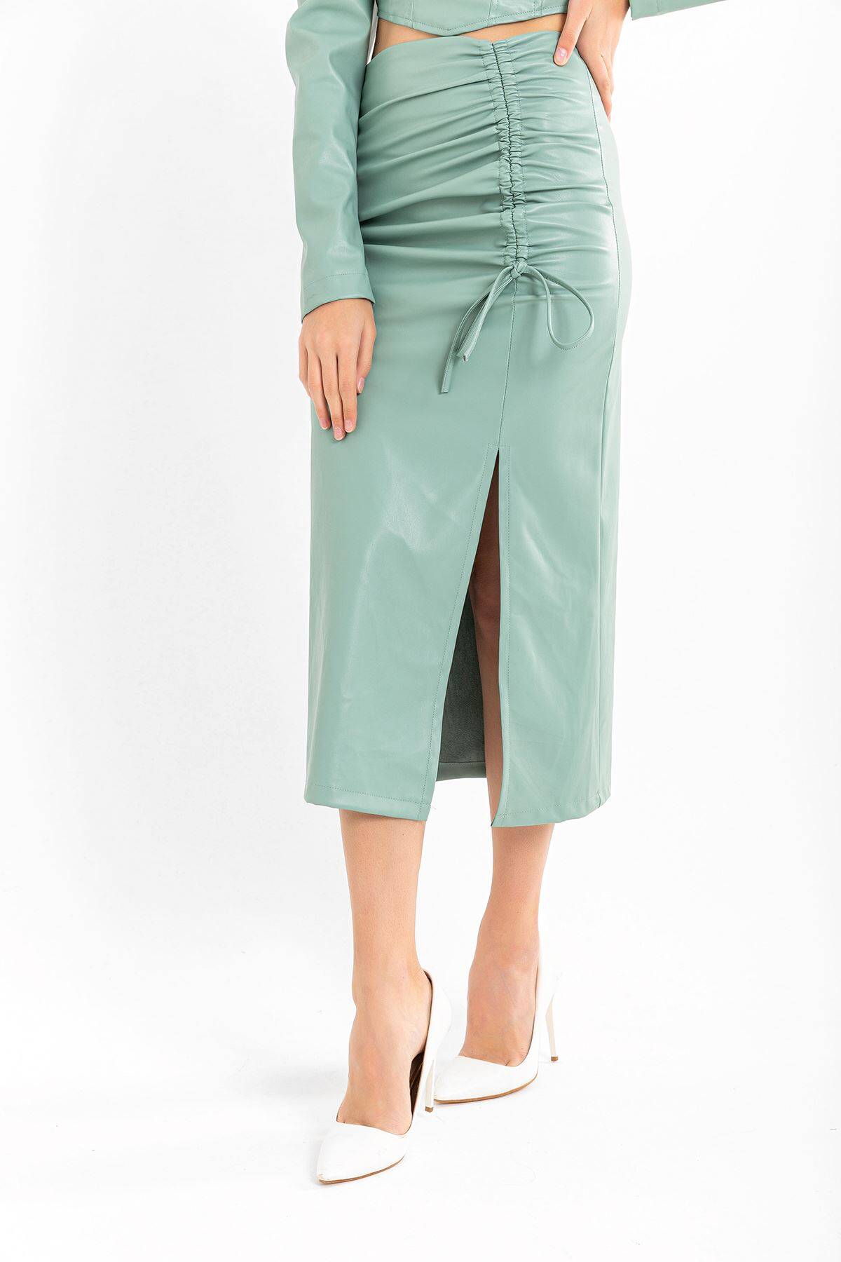 | Ürün Adı | Deri Kumaş Diz Altı Boy Yırtmaçlı Büzgü Detaylı Kadın Etek |