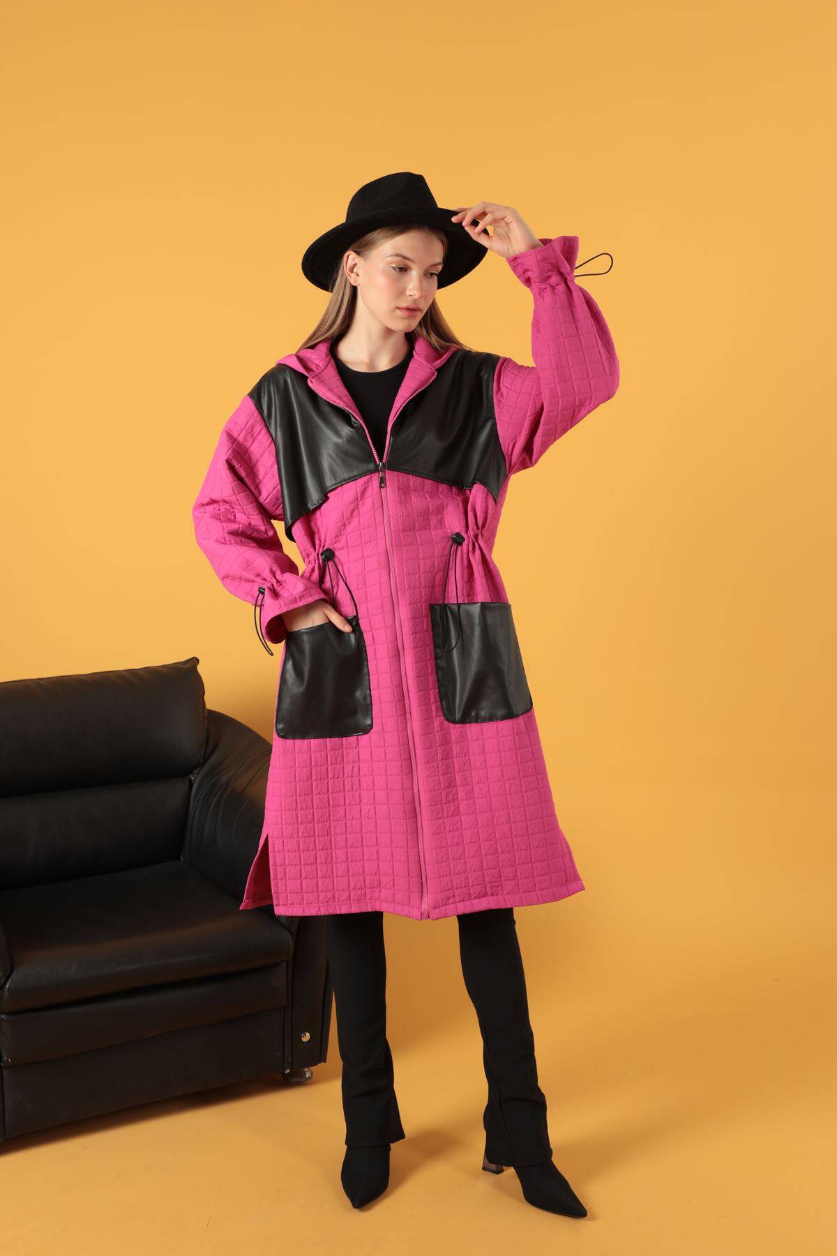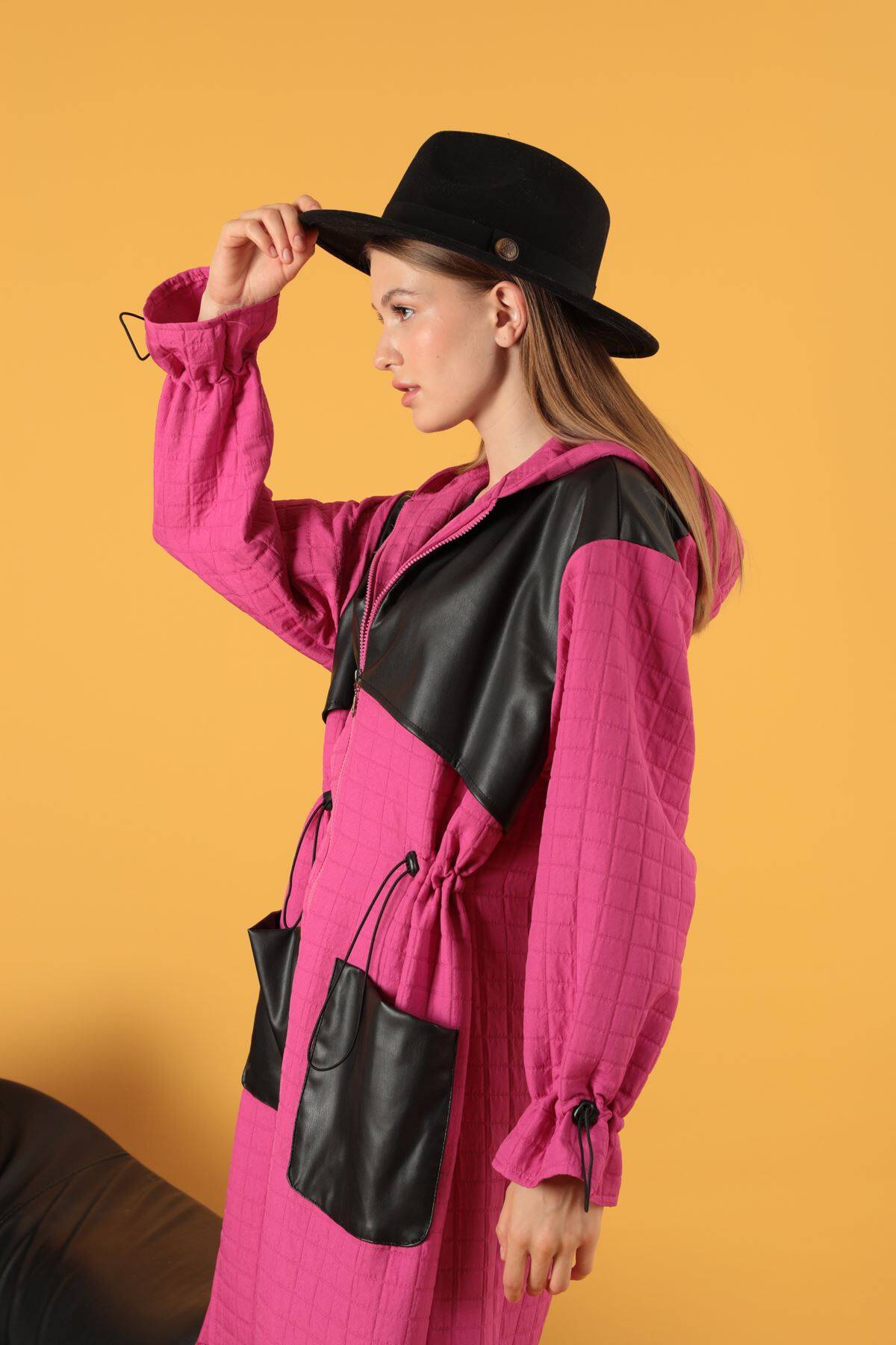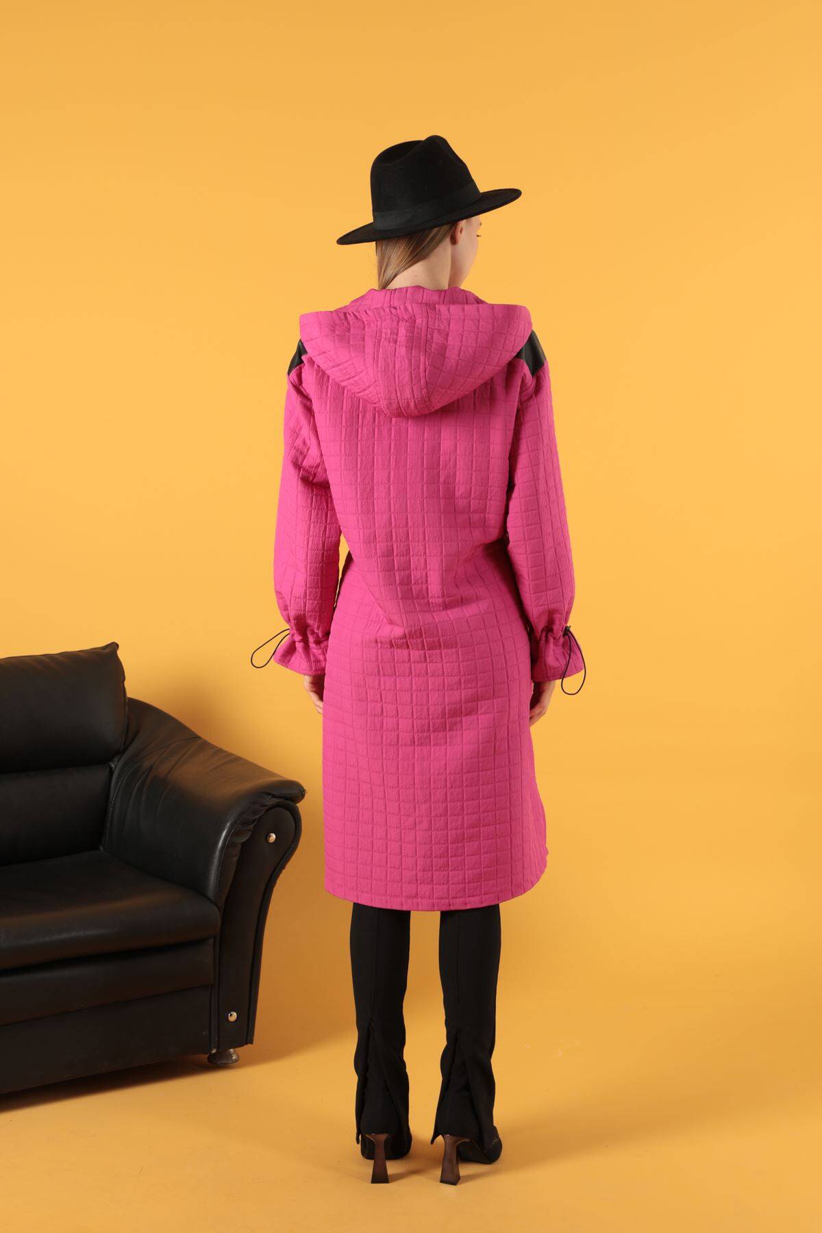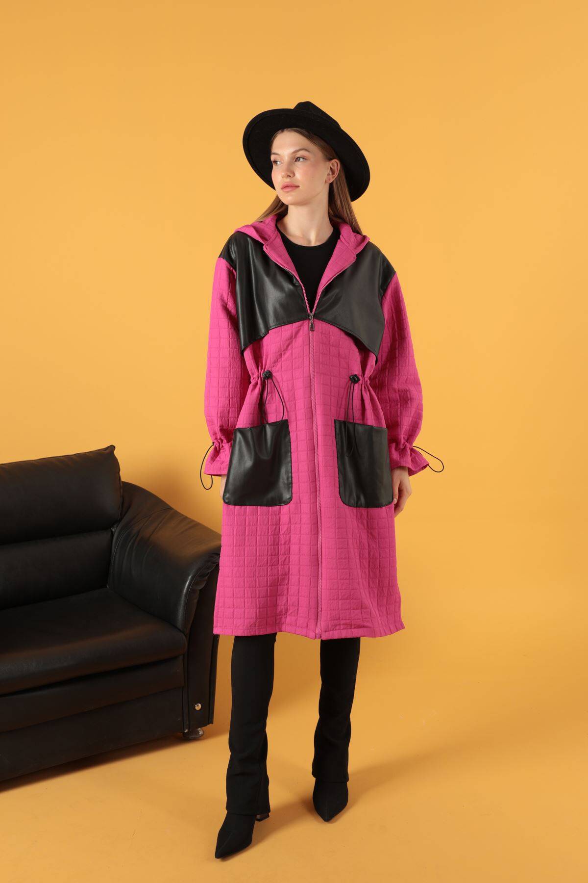 Deri Kumaş Garni Detay Jakar Kadın Trençkot-Fuşya