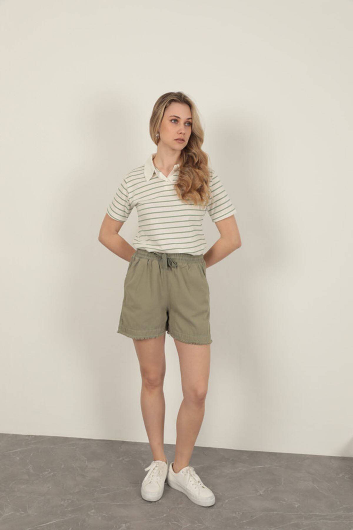 Garbardin Kumaş Püsküllü Kadın Şort-Haki