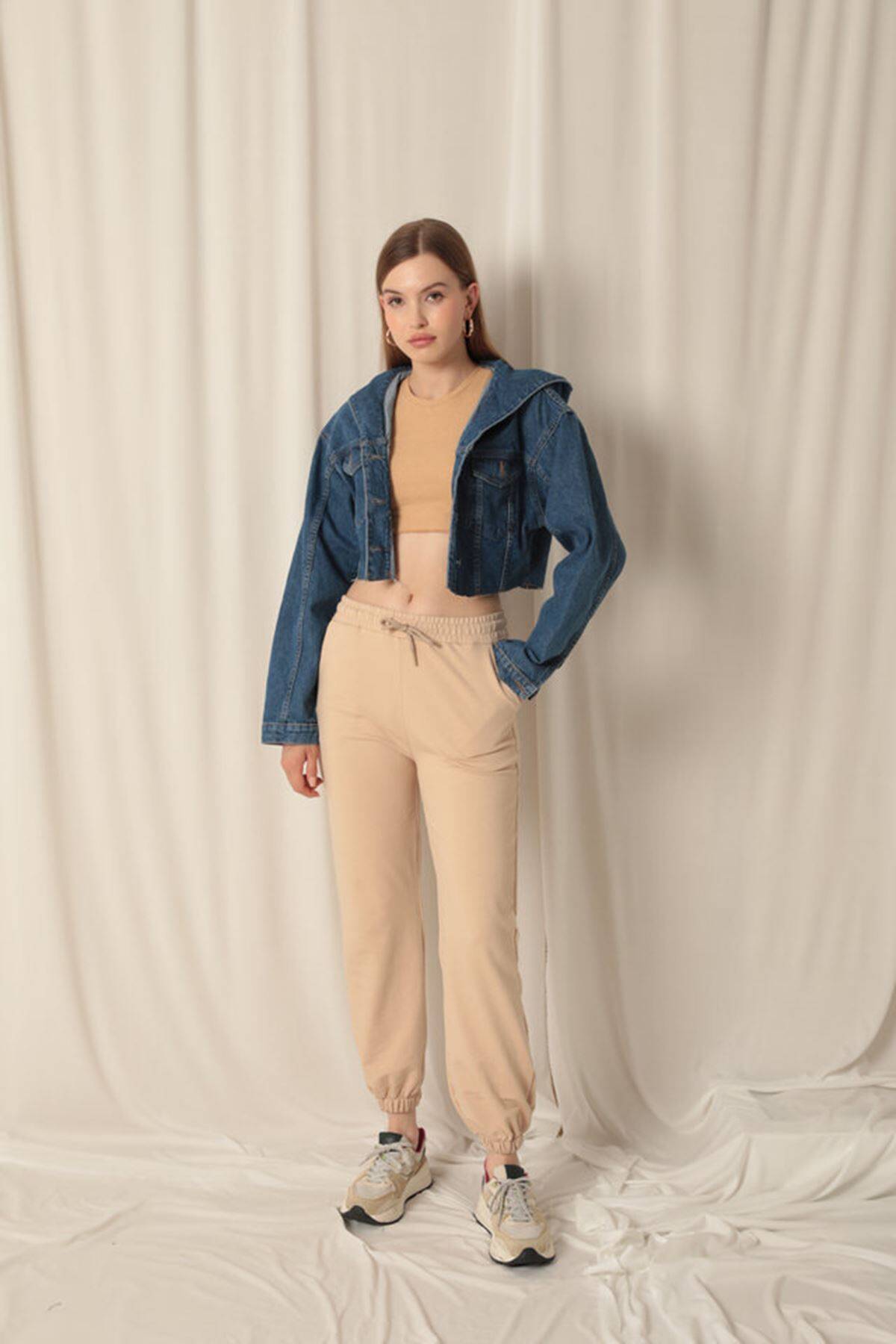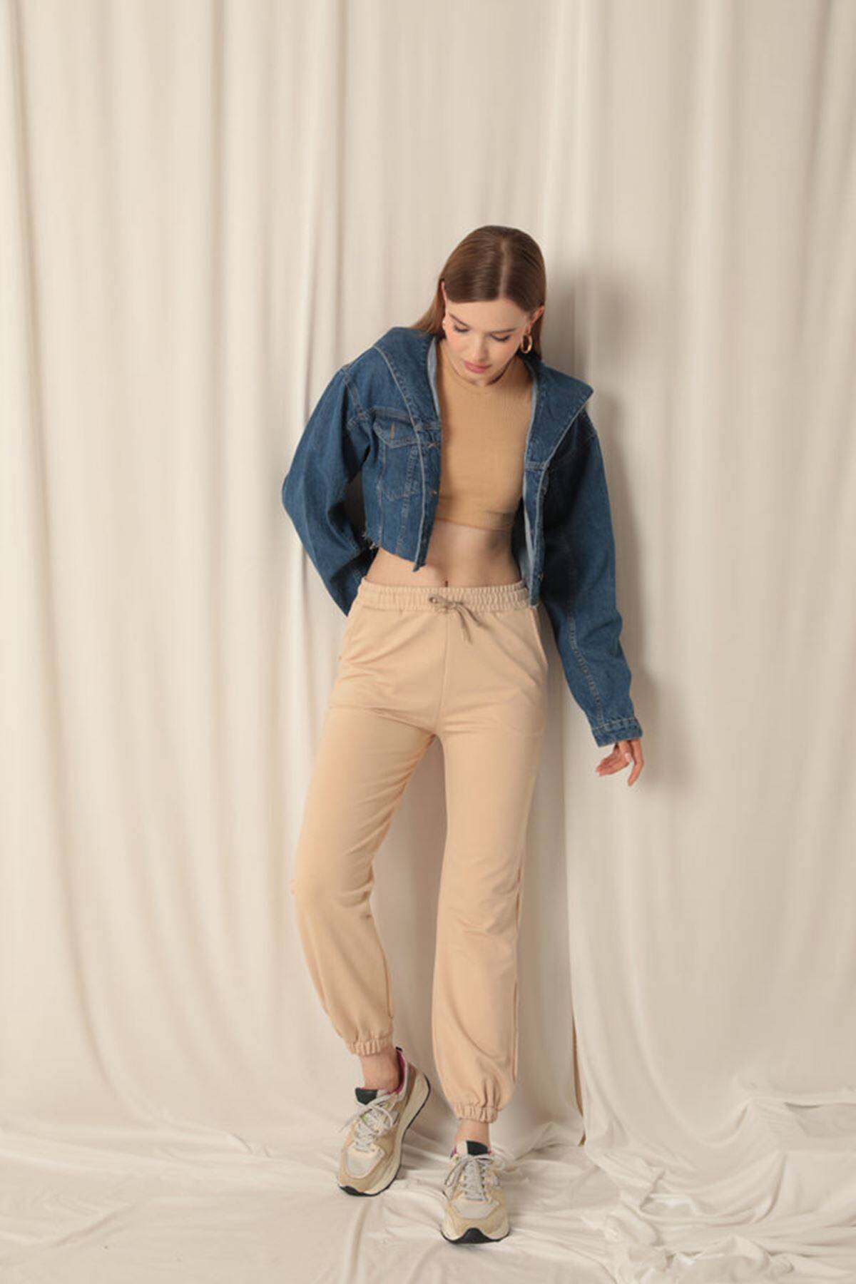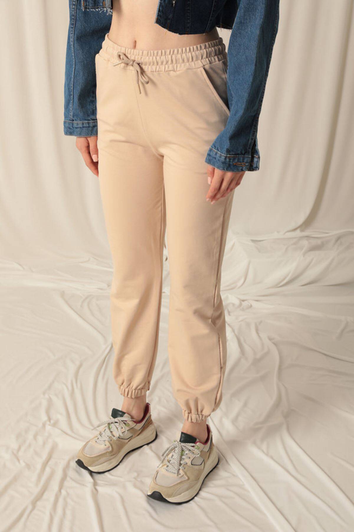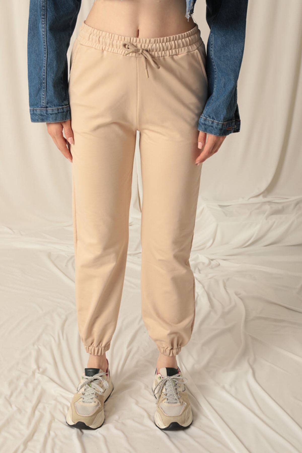 İki İplik Kumaş Paçası Lastikli Kadın Bej Eşofman