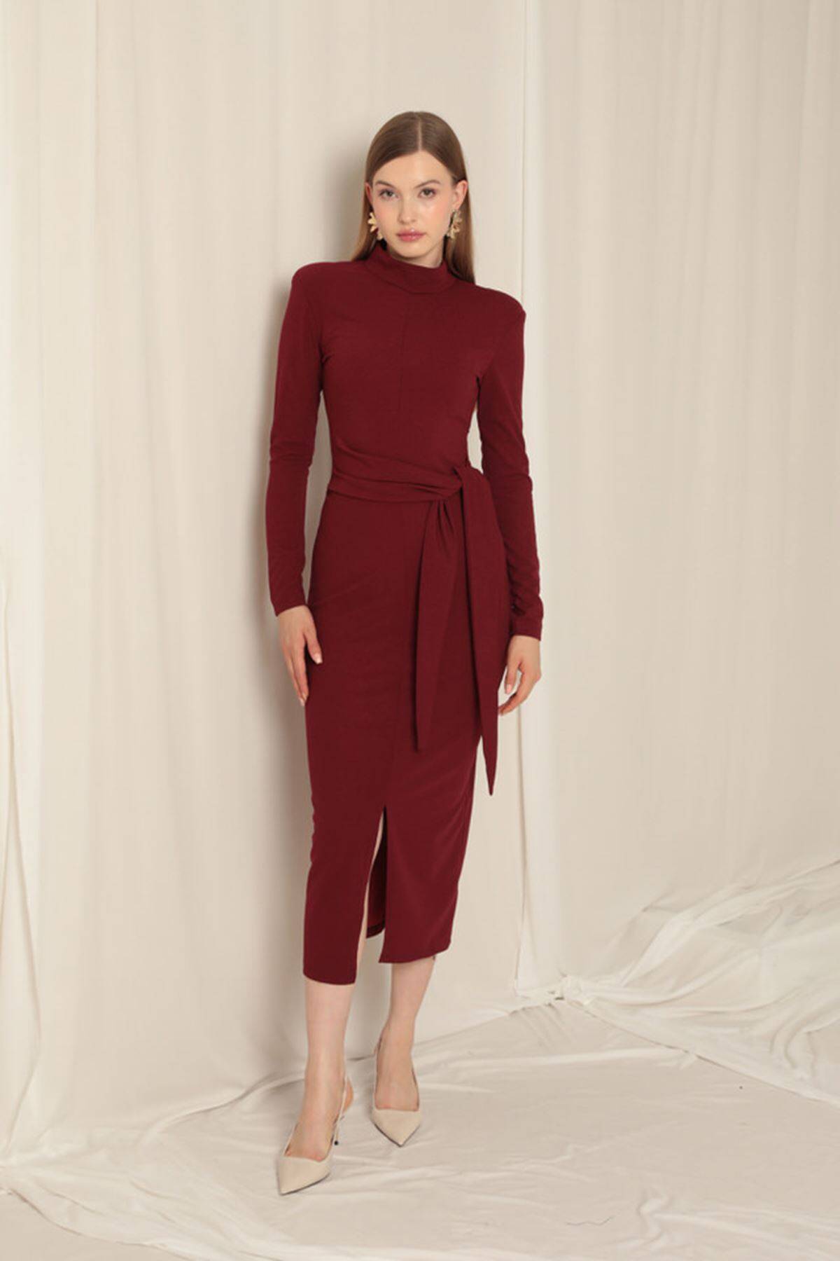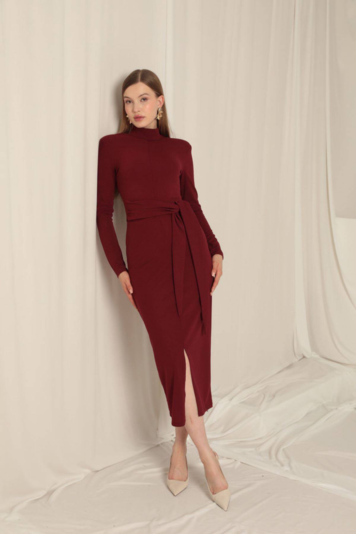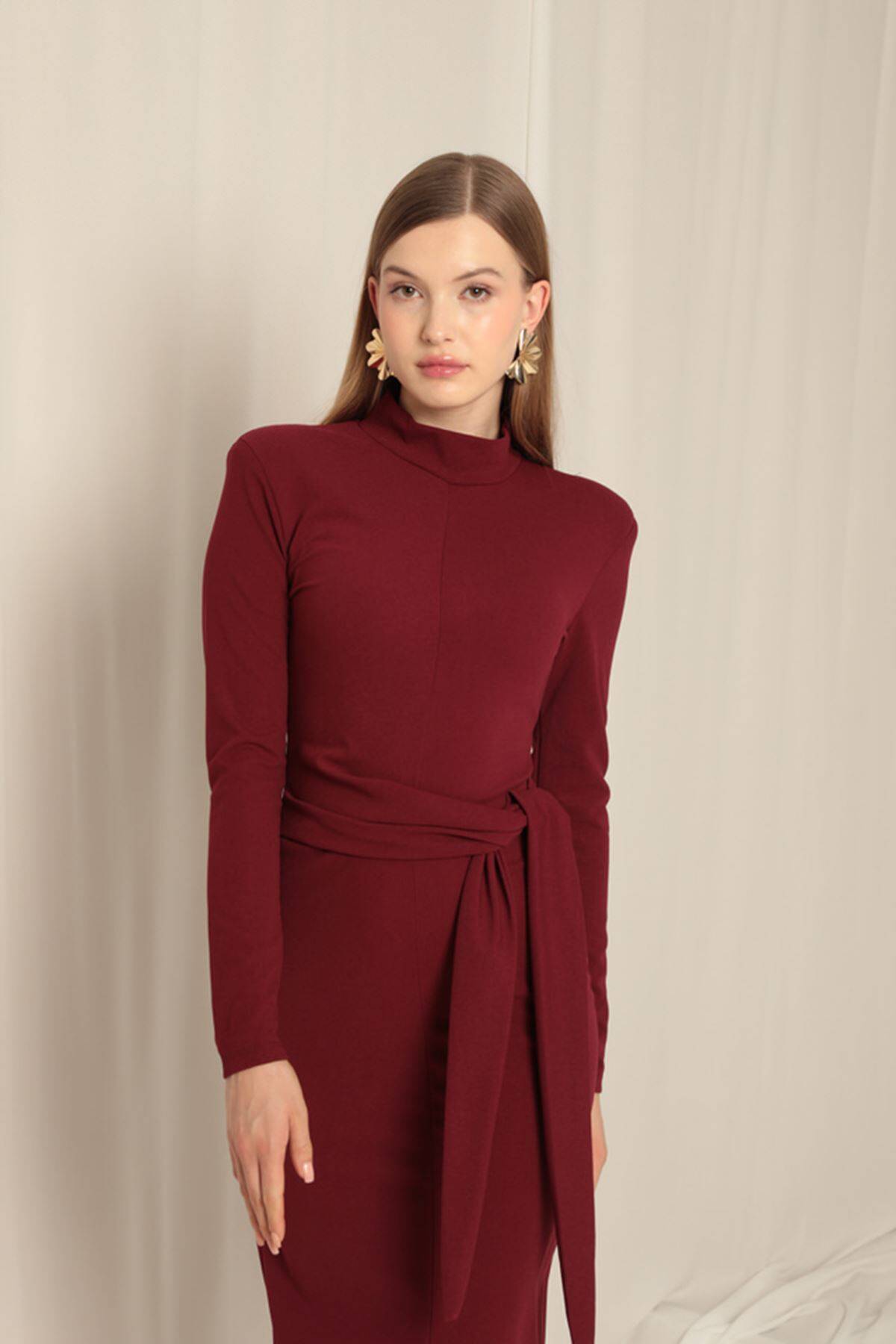 Krep Kumaş Bağlamalı Bordo Elbise