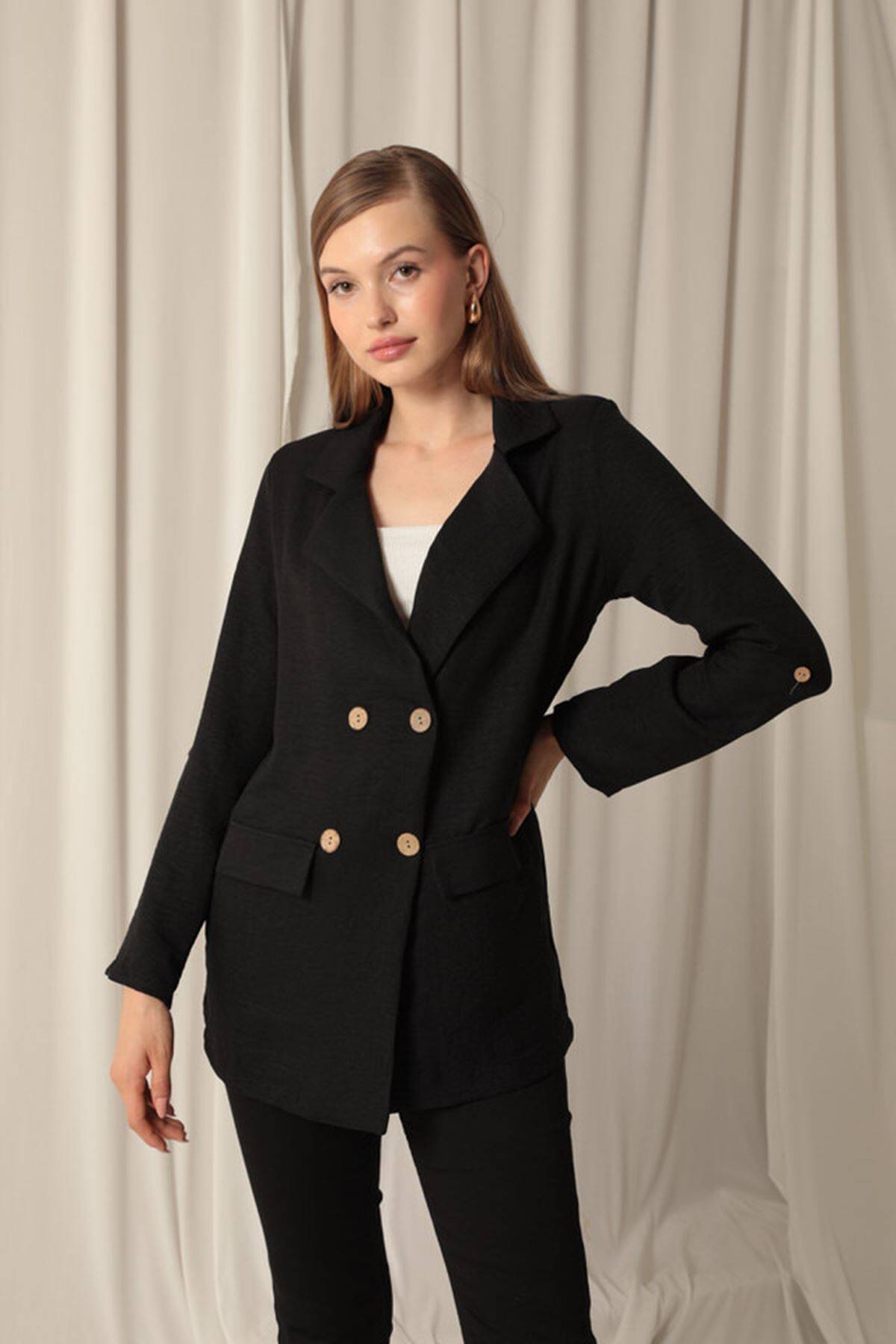 Melanj Keten Kumaş Kadın Siyah Ceket