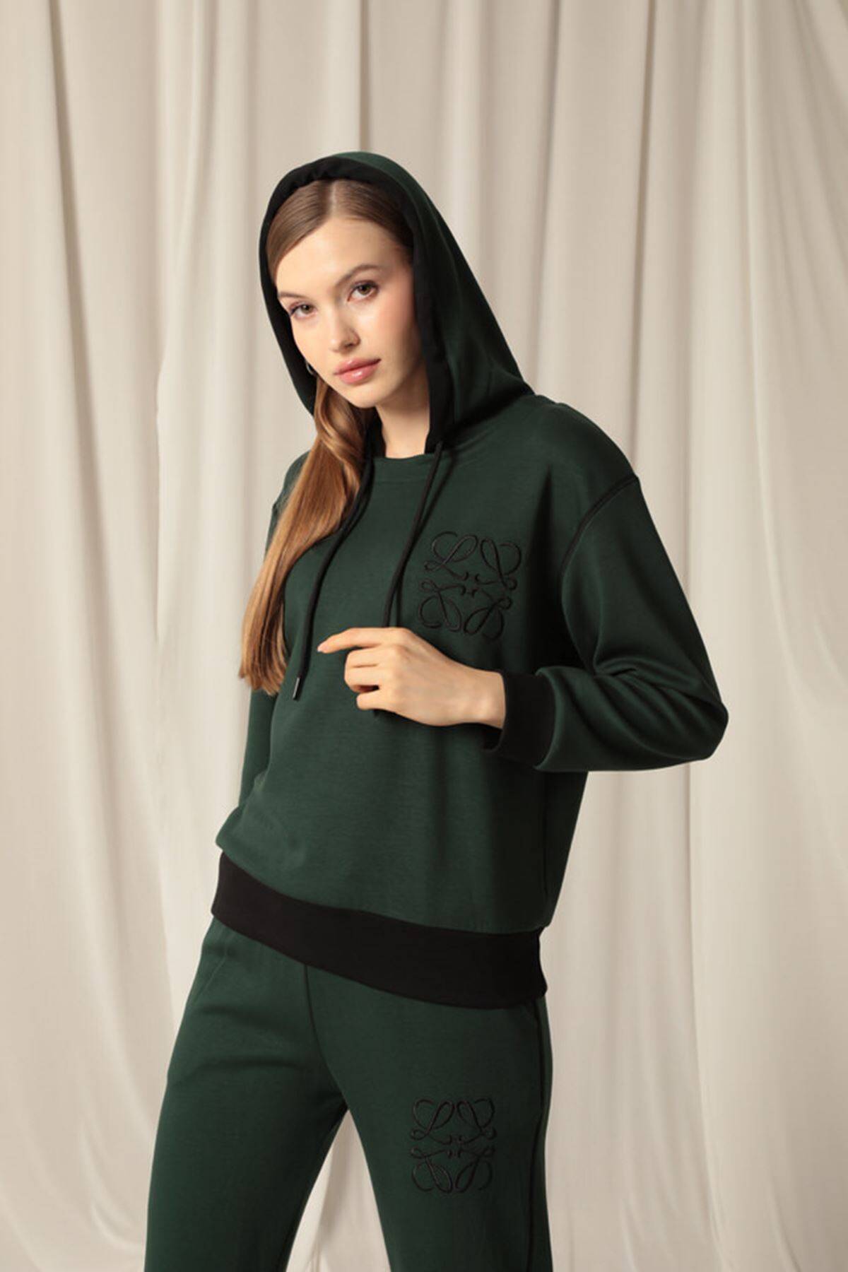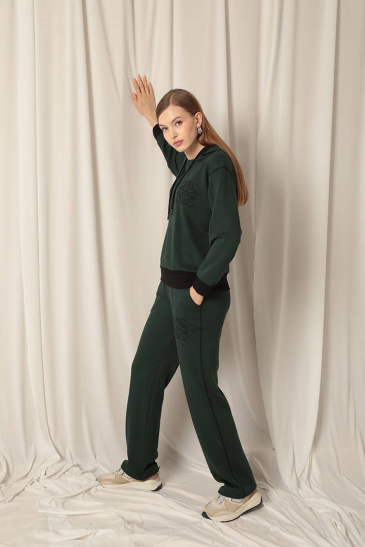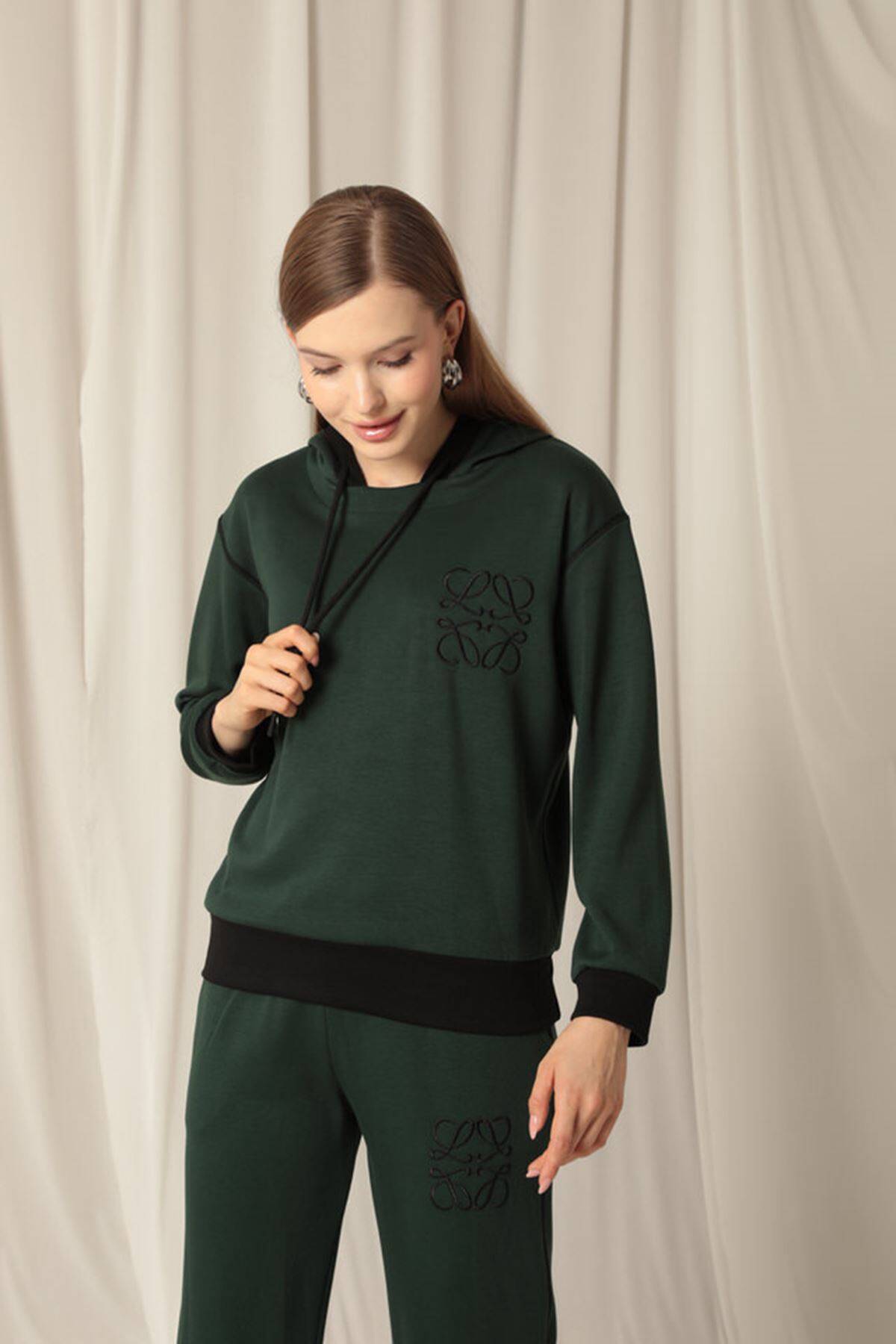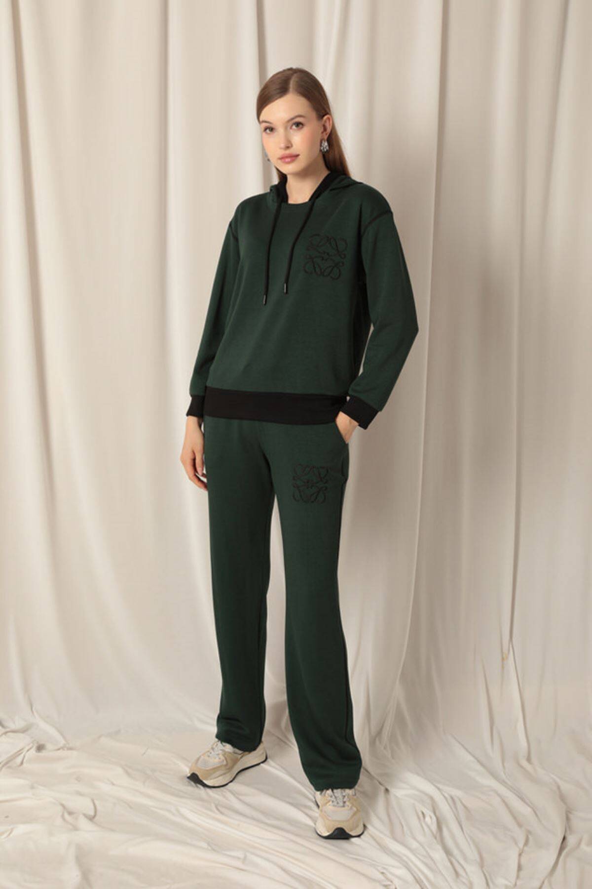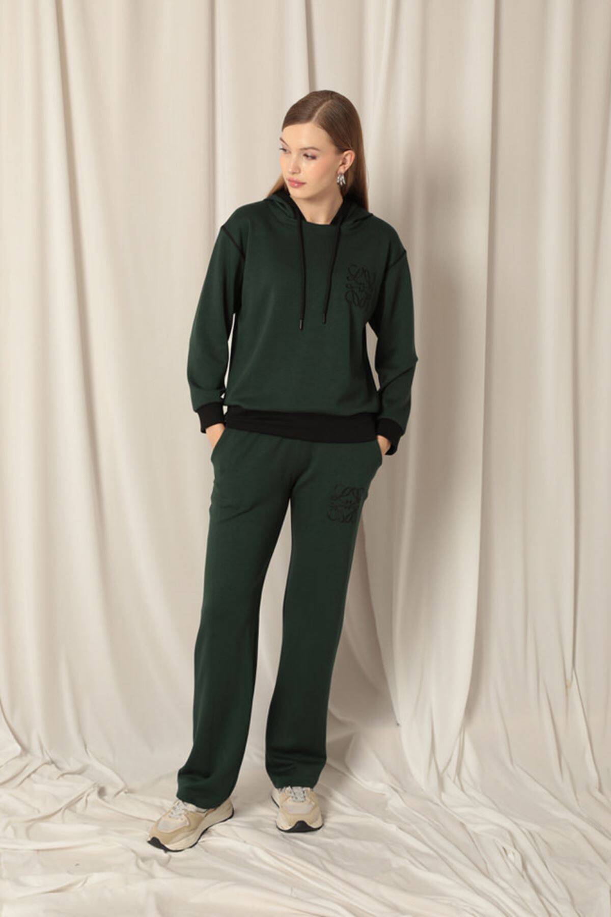 Modal Kumaş Nakışlı Garnili Kadın Zümrüt Yeşil Takım