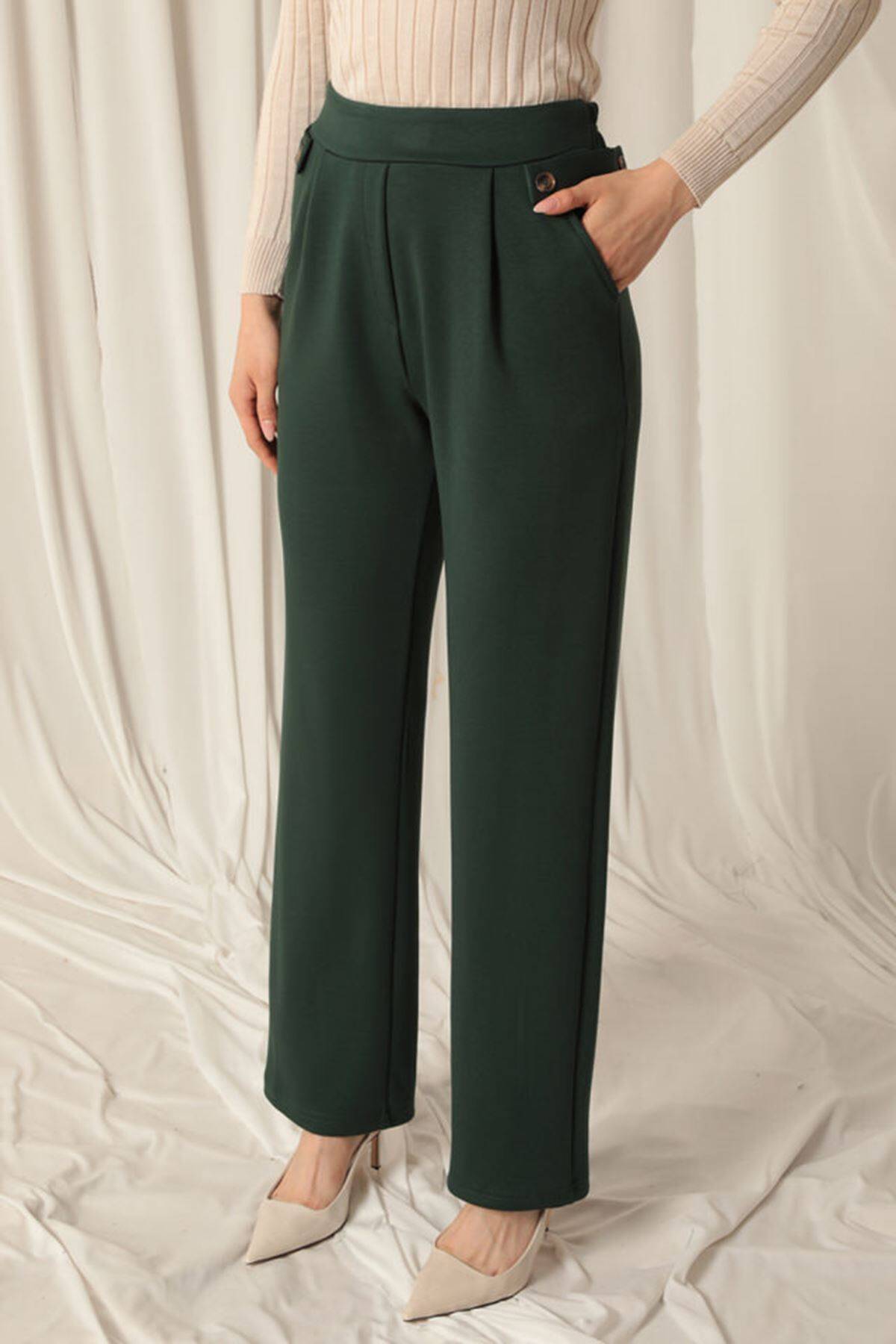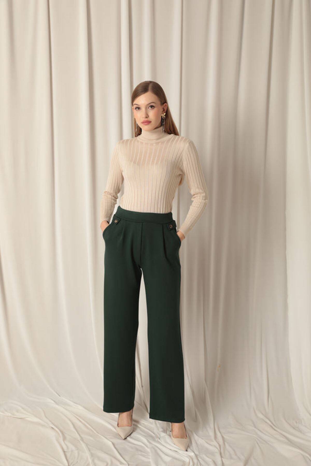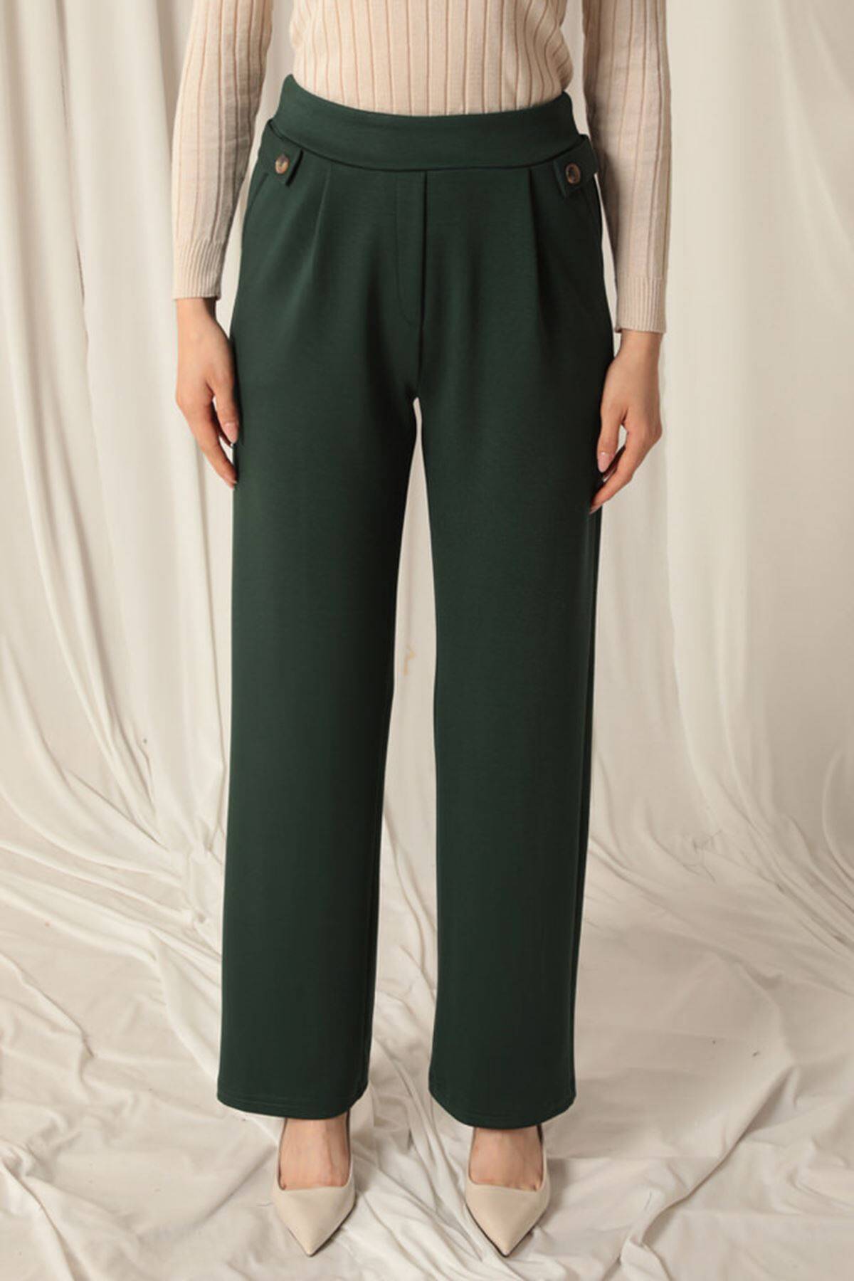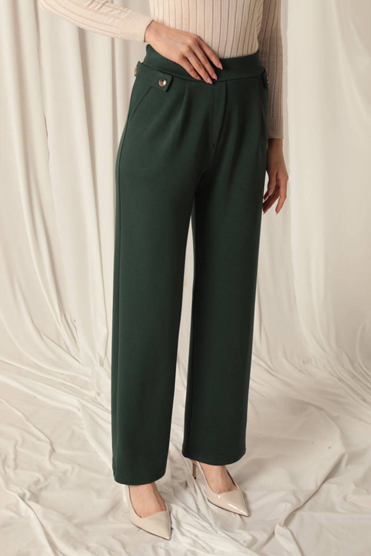 Modal Kumaş Yanları Düğmeli Kadın Zümrüt Yeşil Pantolon