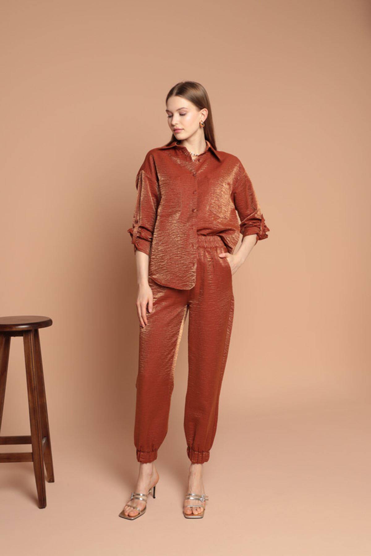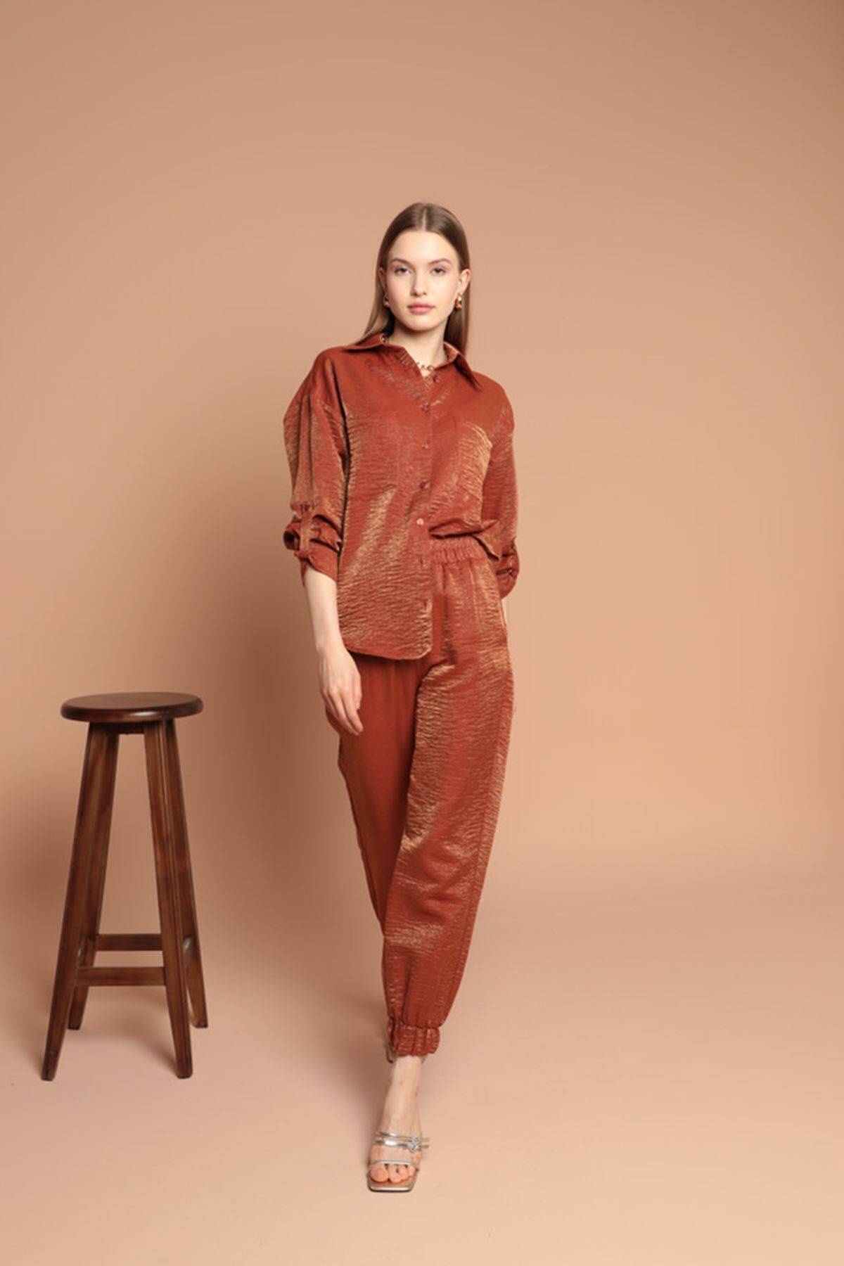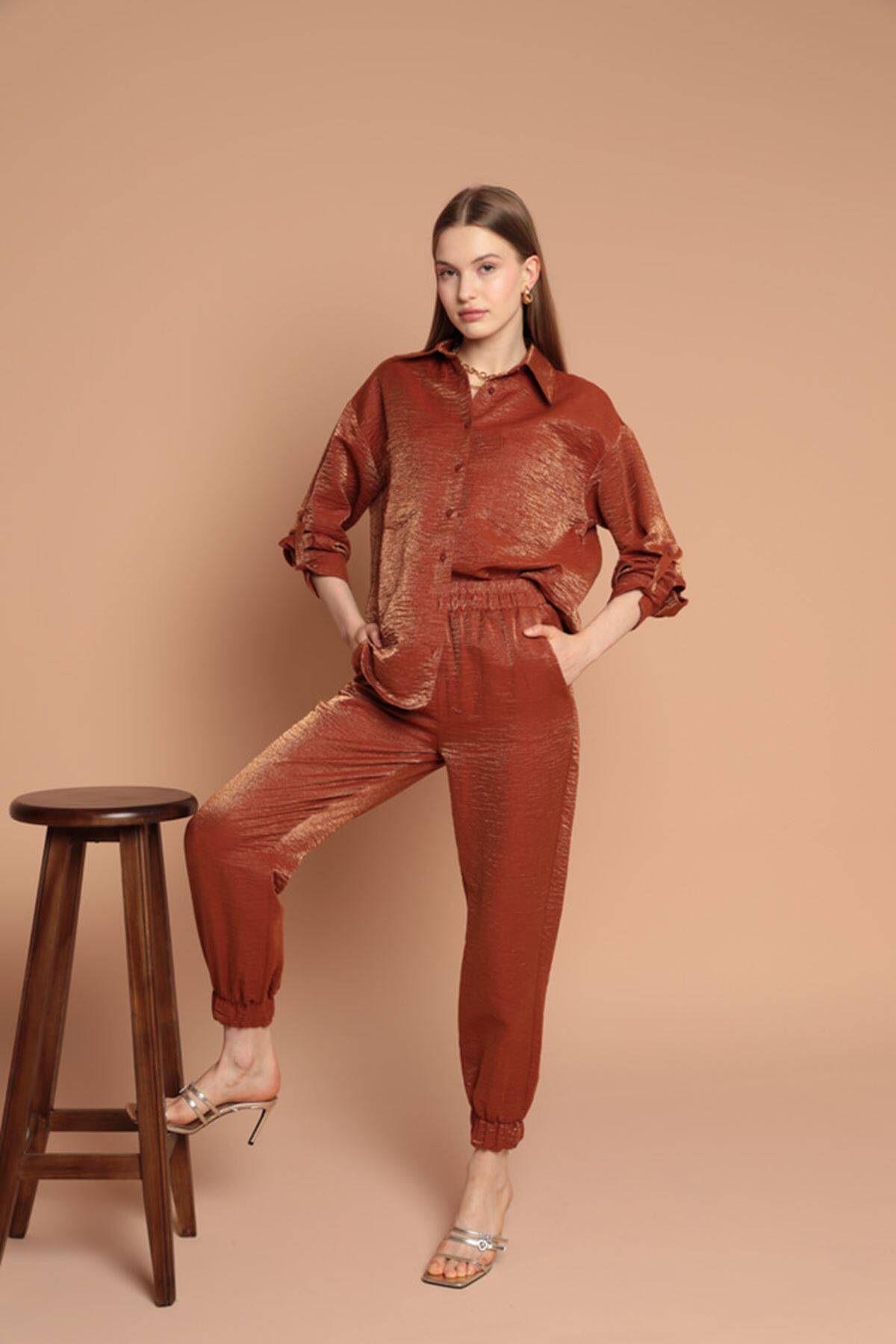 Parlak Kumaş Kadın Takım-Kahve