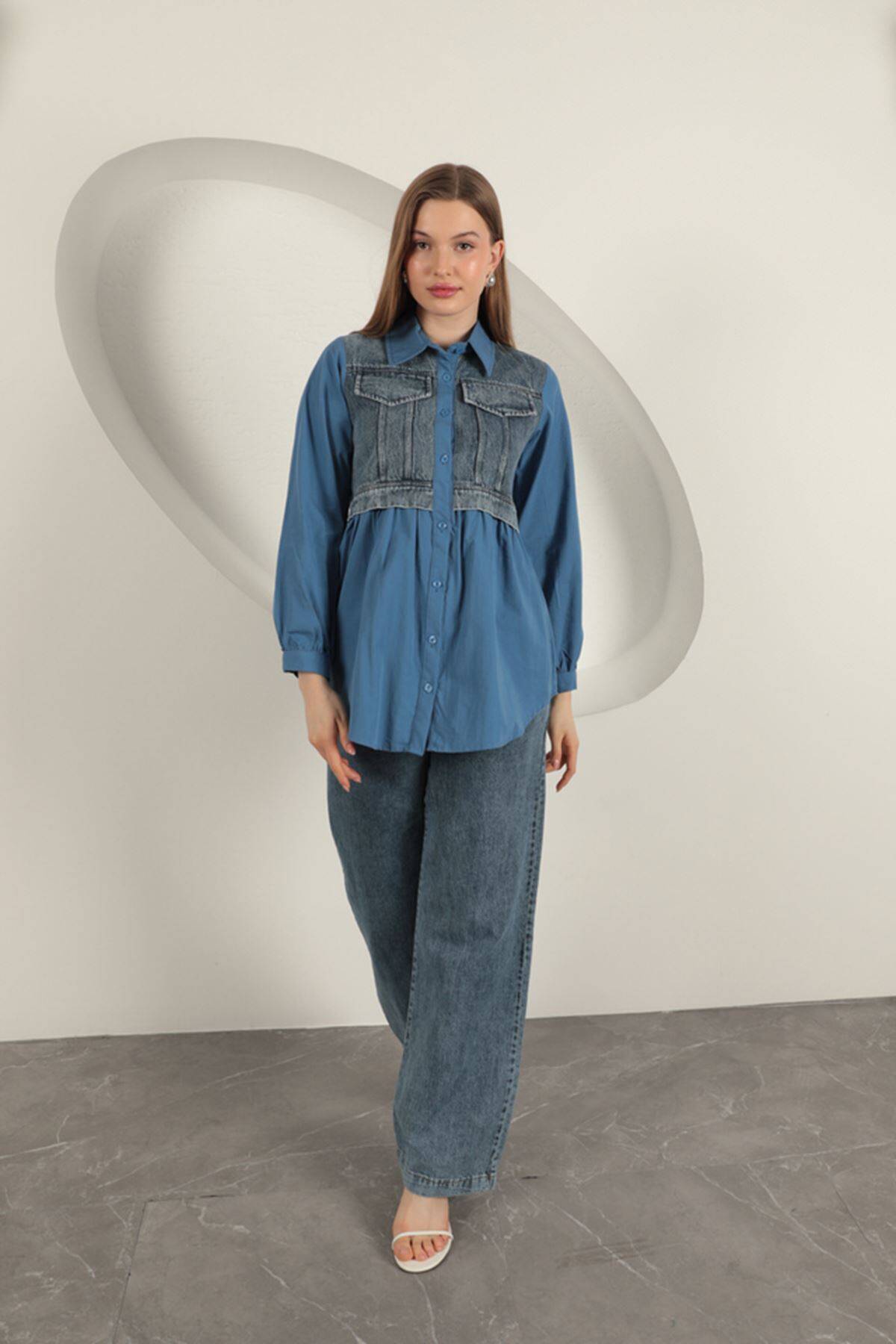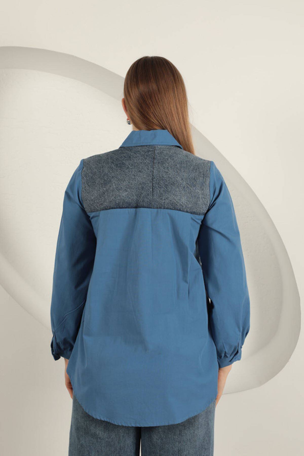 Poplin Kumaş Kot Garnili İndigo Kadın Gömlek
