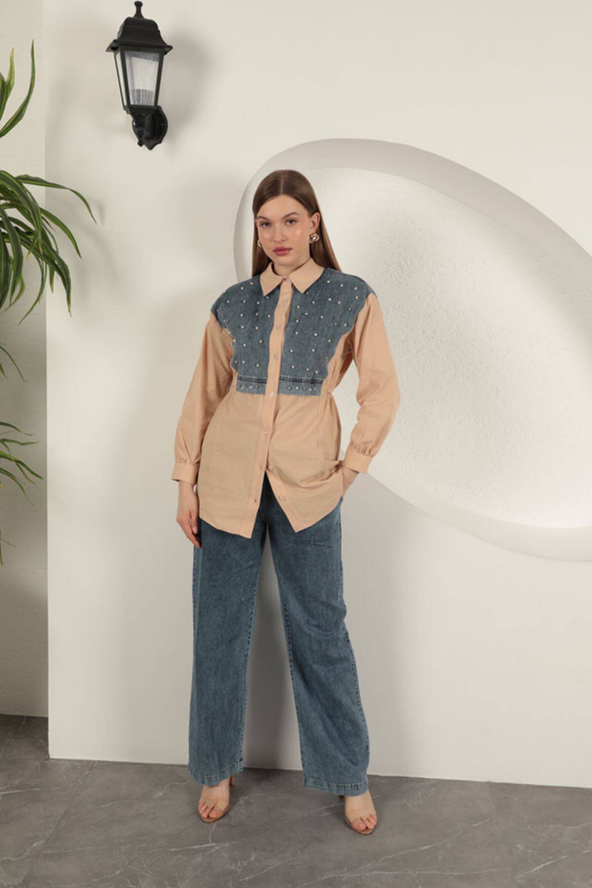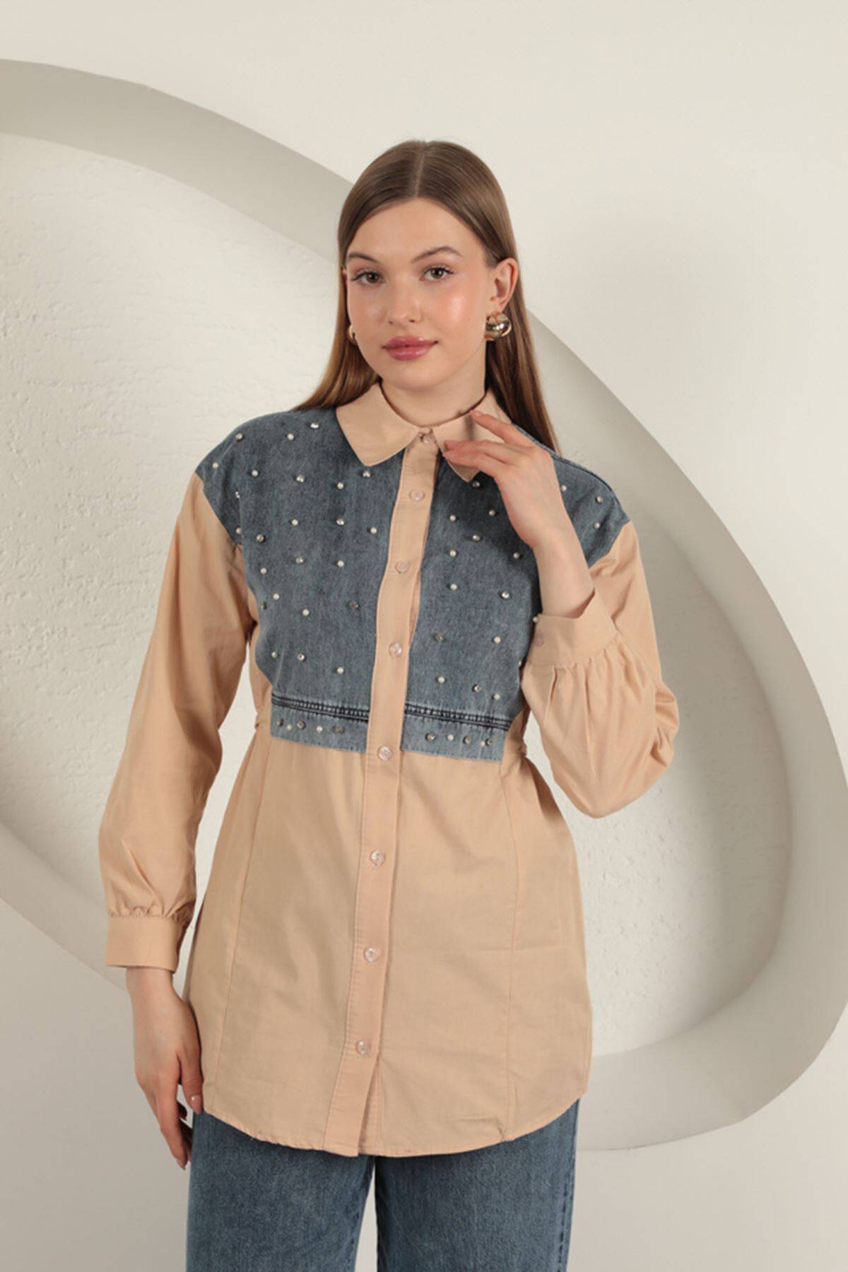 Poplin Kumaş Önü İnci Detaylı Bej Kadın Gömlek