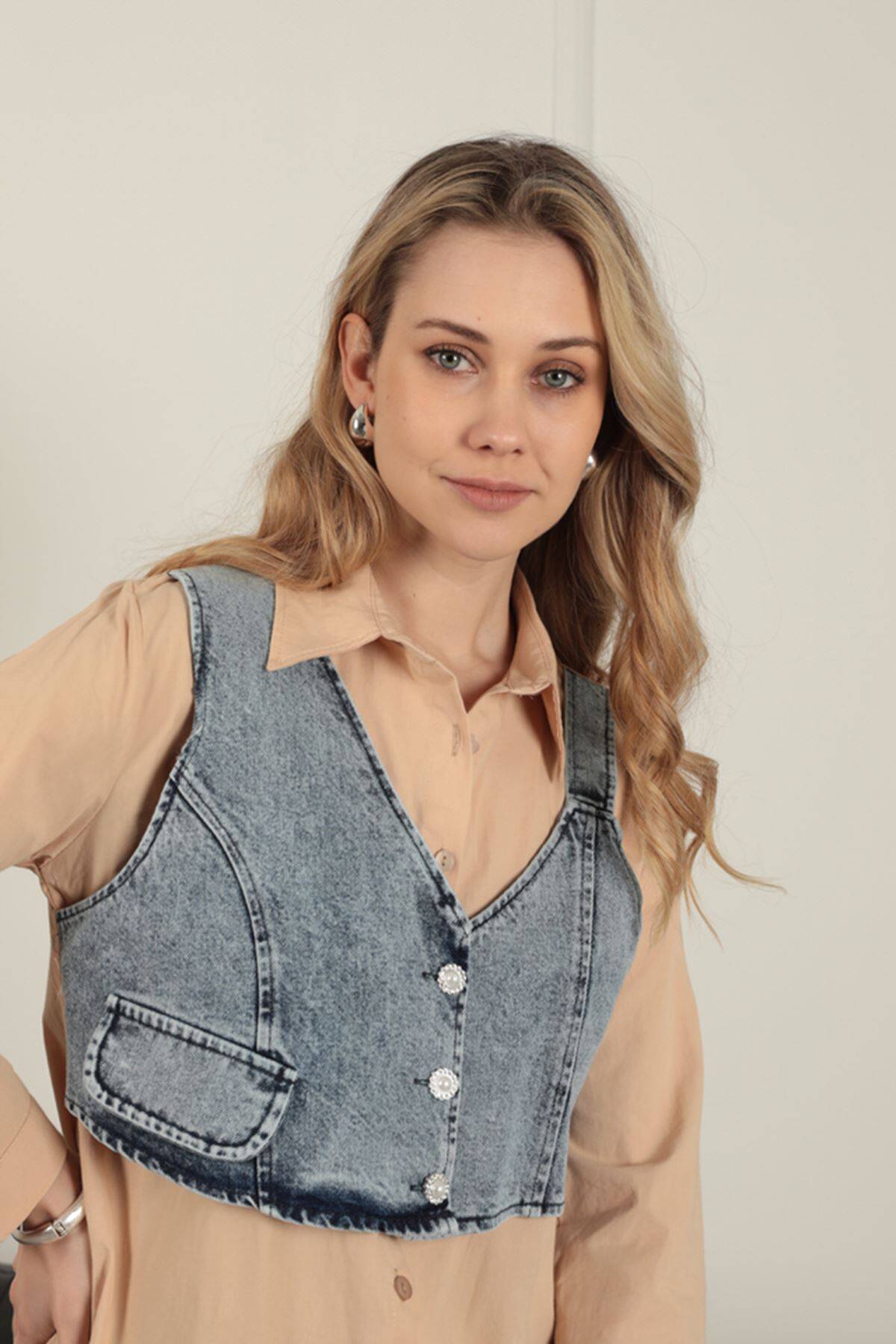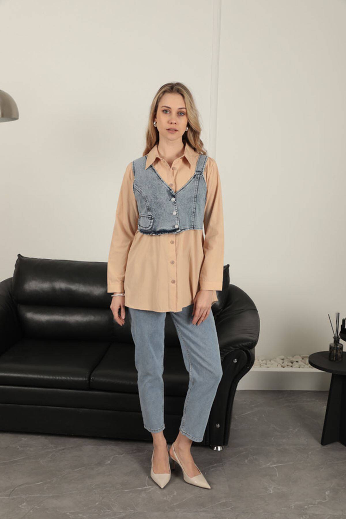 Poplin Kumaş Yelek Detaylı Bej Kadın Gömlek