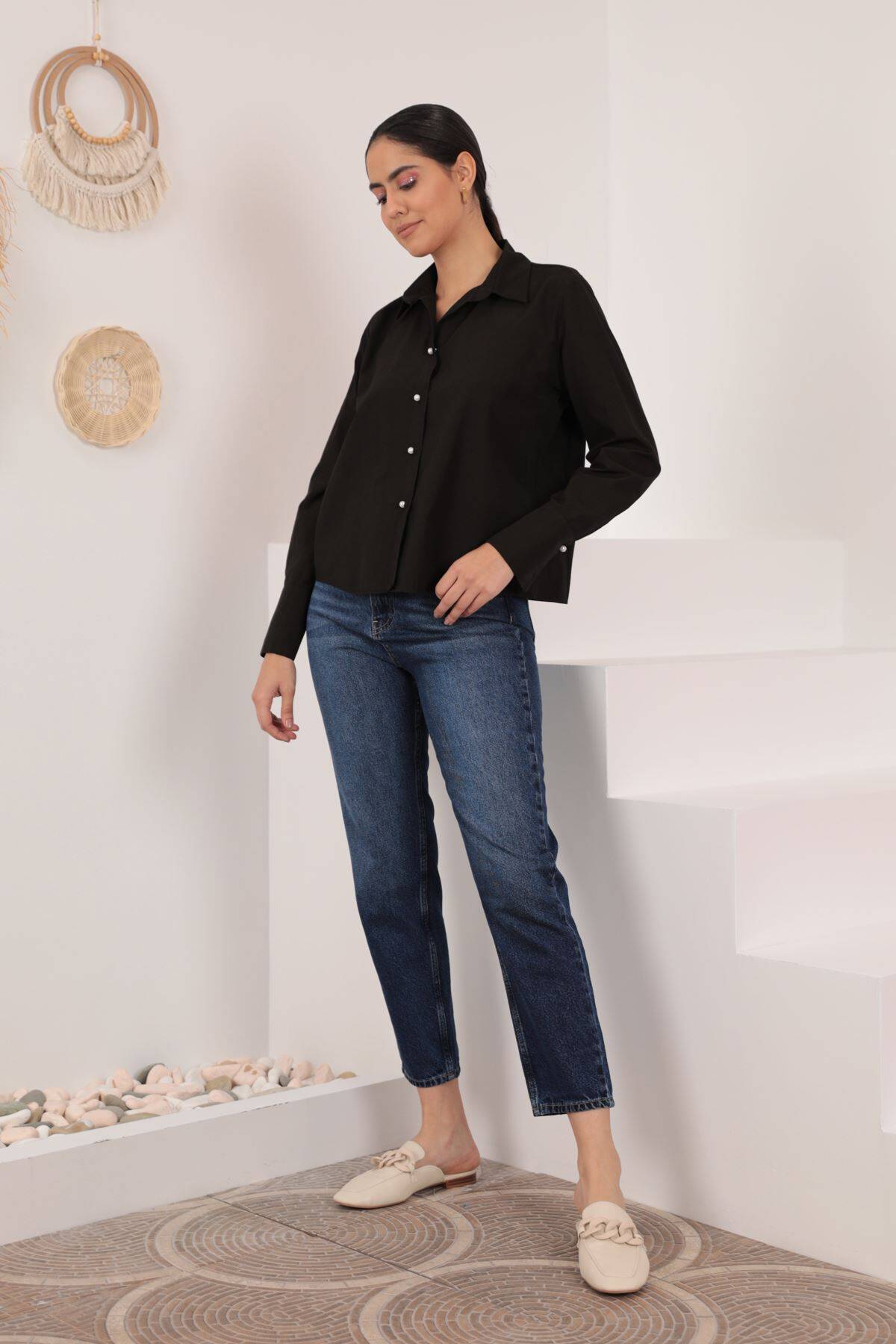 Soft Kumaş Crop Kadın İnci Düğme Detay Gömlek-Acı Kahve
