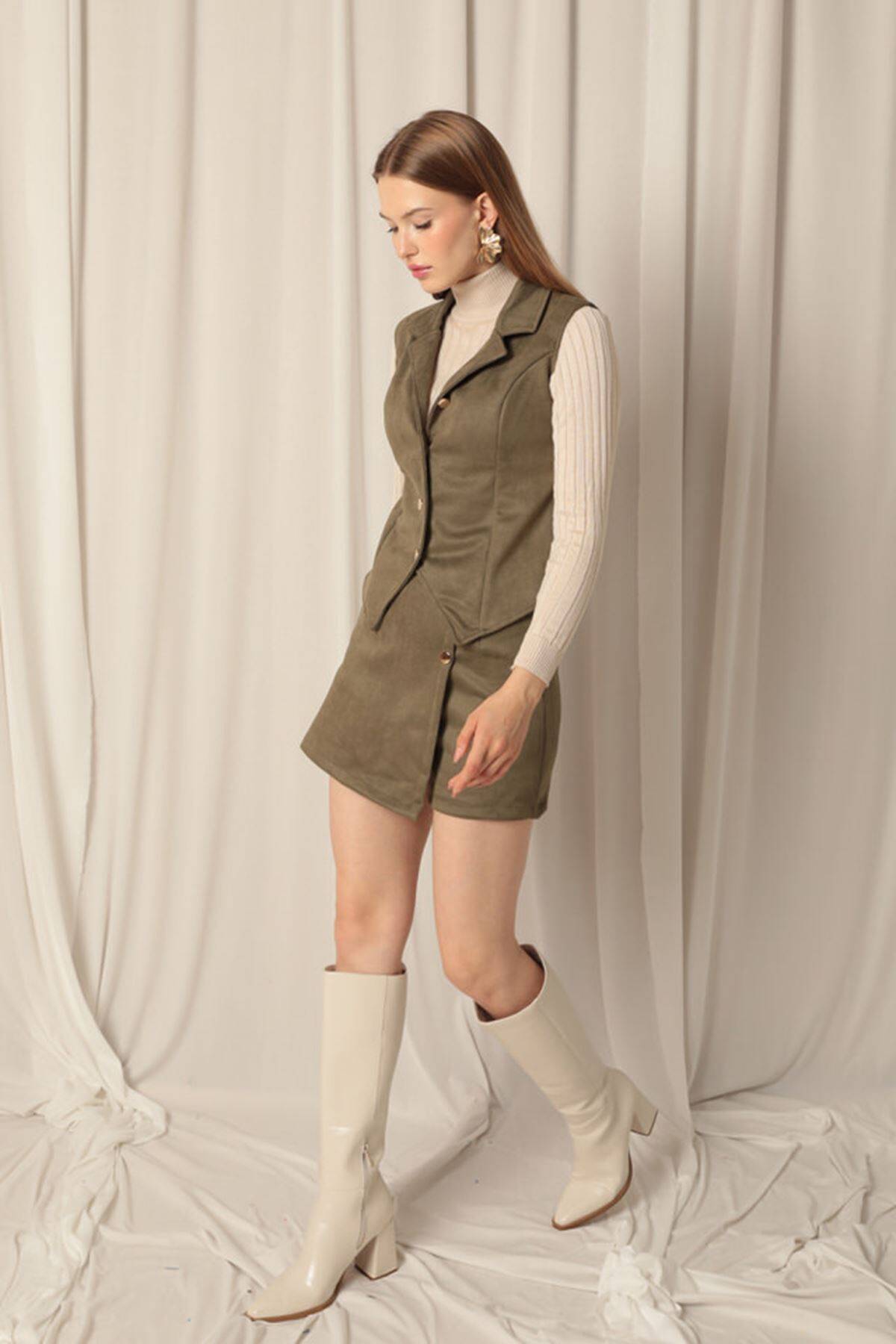 Süet Kumaş Haki Şort Etek