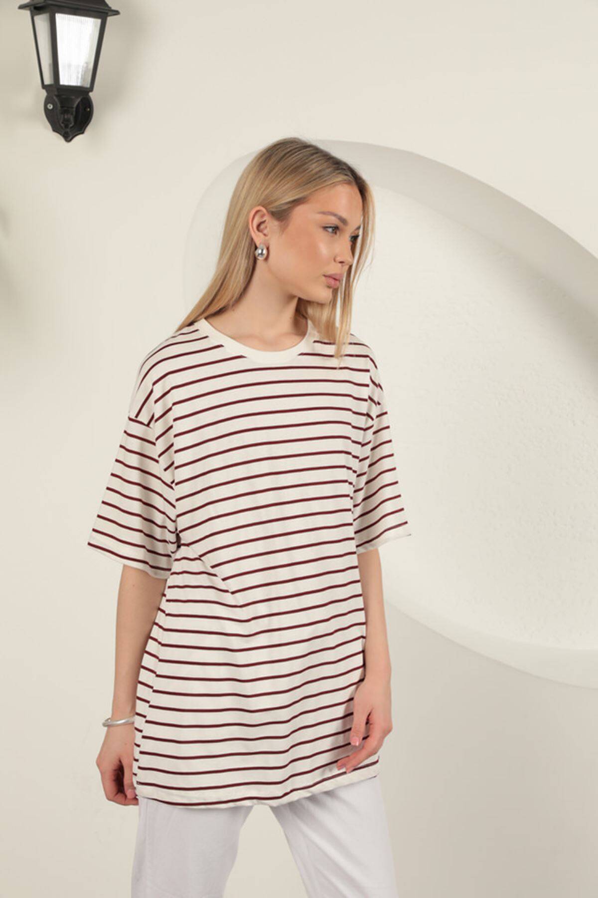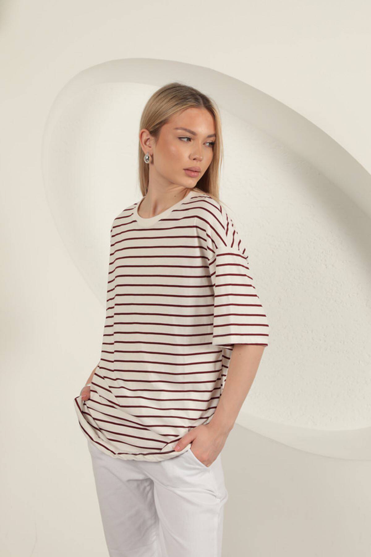 Süprem Kumaş Çizgili Sıfır Yaka Tişört-Bordo