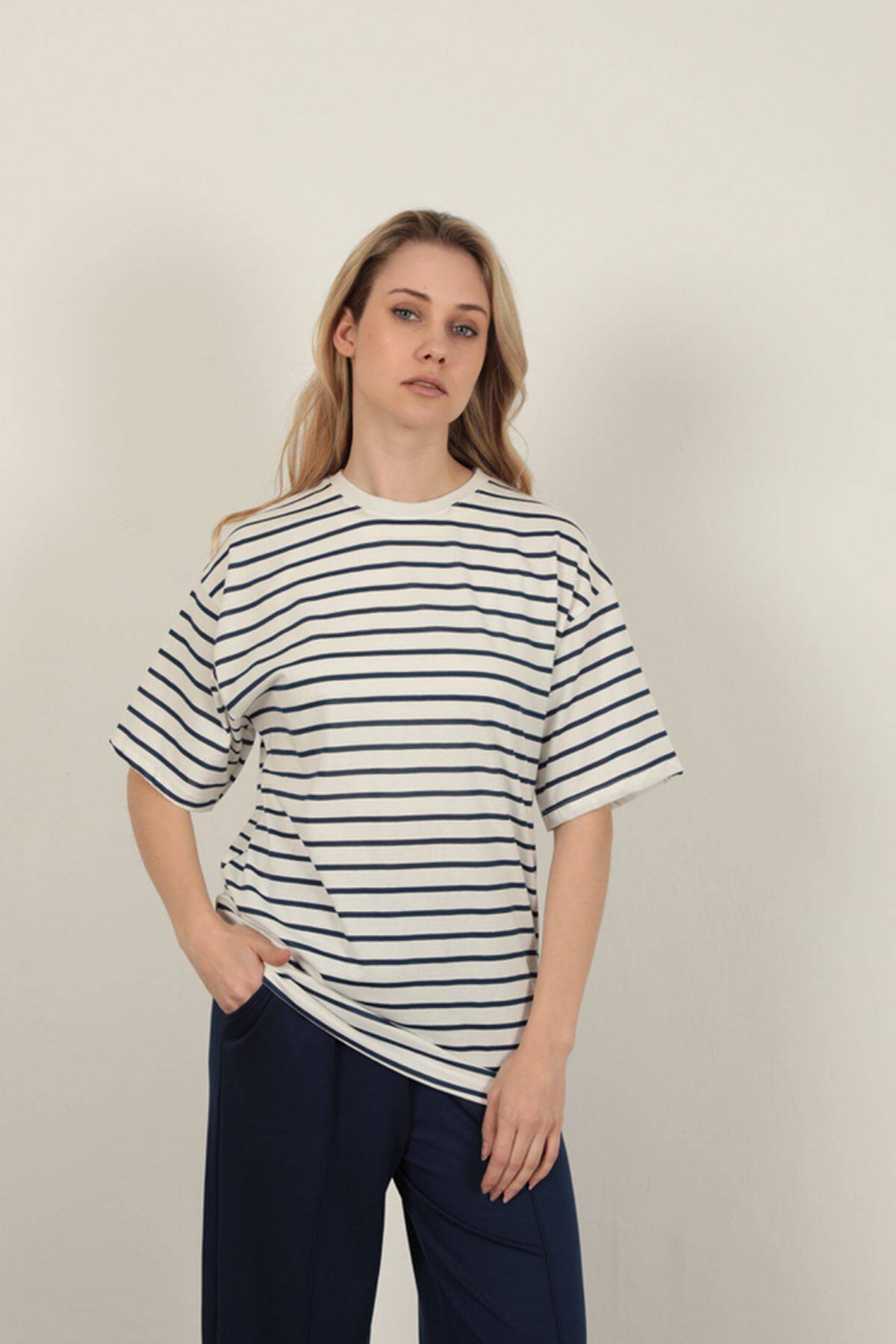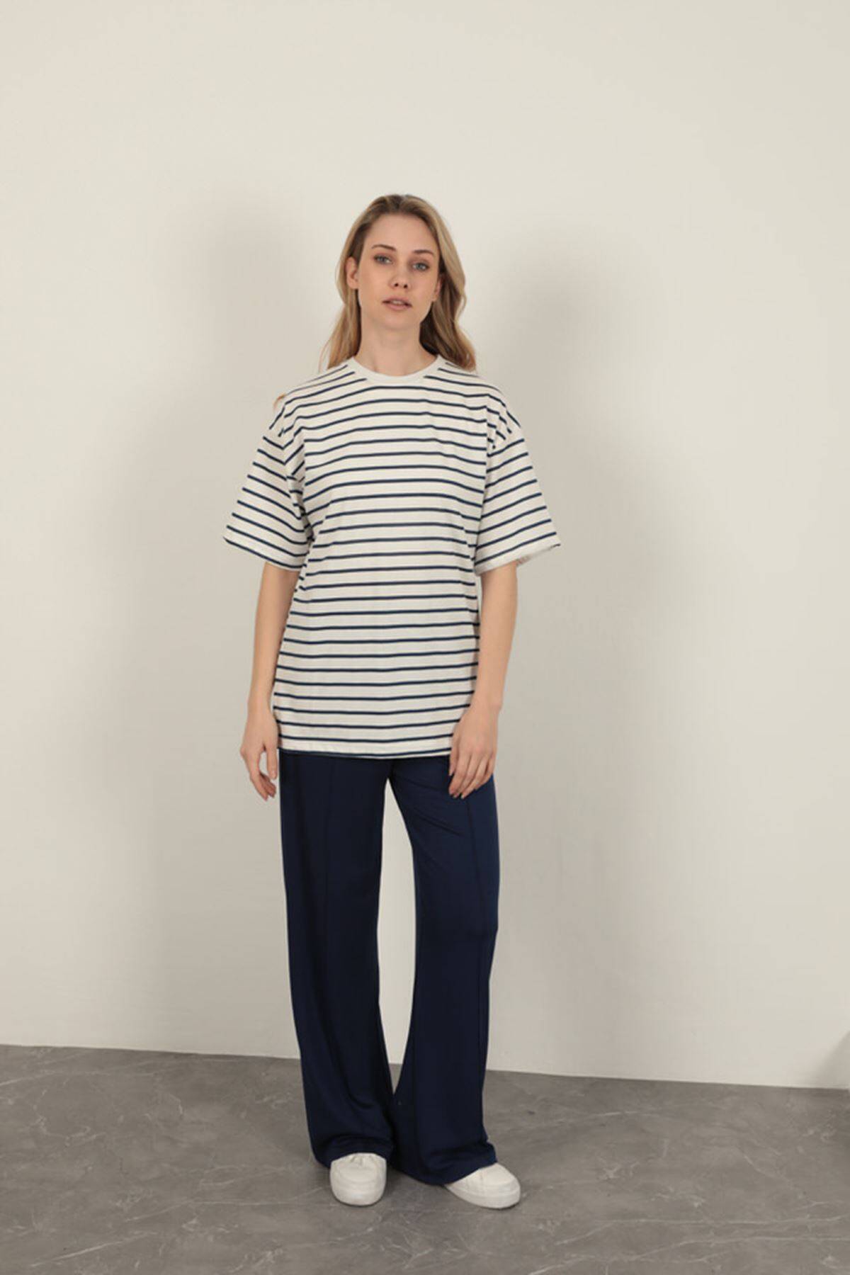 Süprem Kumaş Çizgili Sıfır Yaka Tişört-Lacivert