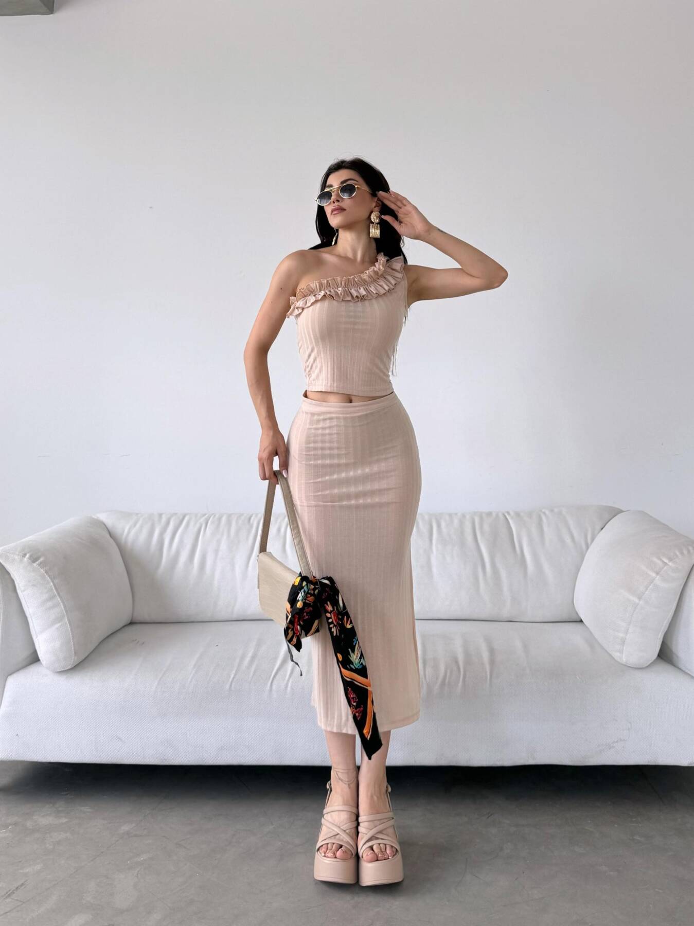 Tek Omuz Fırfır Detaylı Etek Ve Bluz Alt Üst Takım