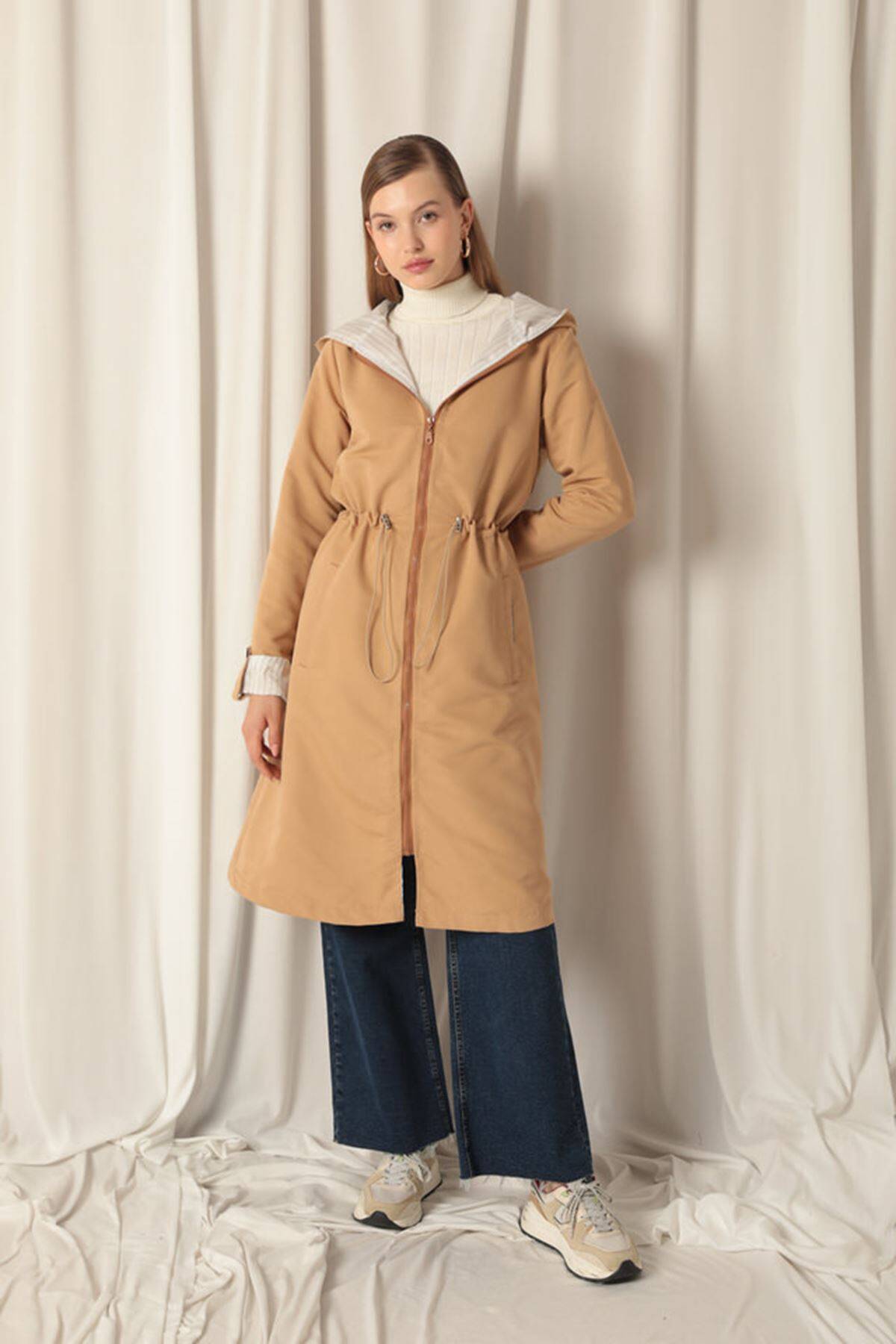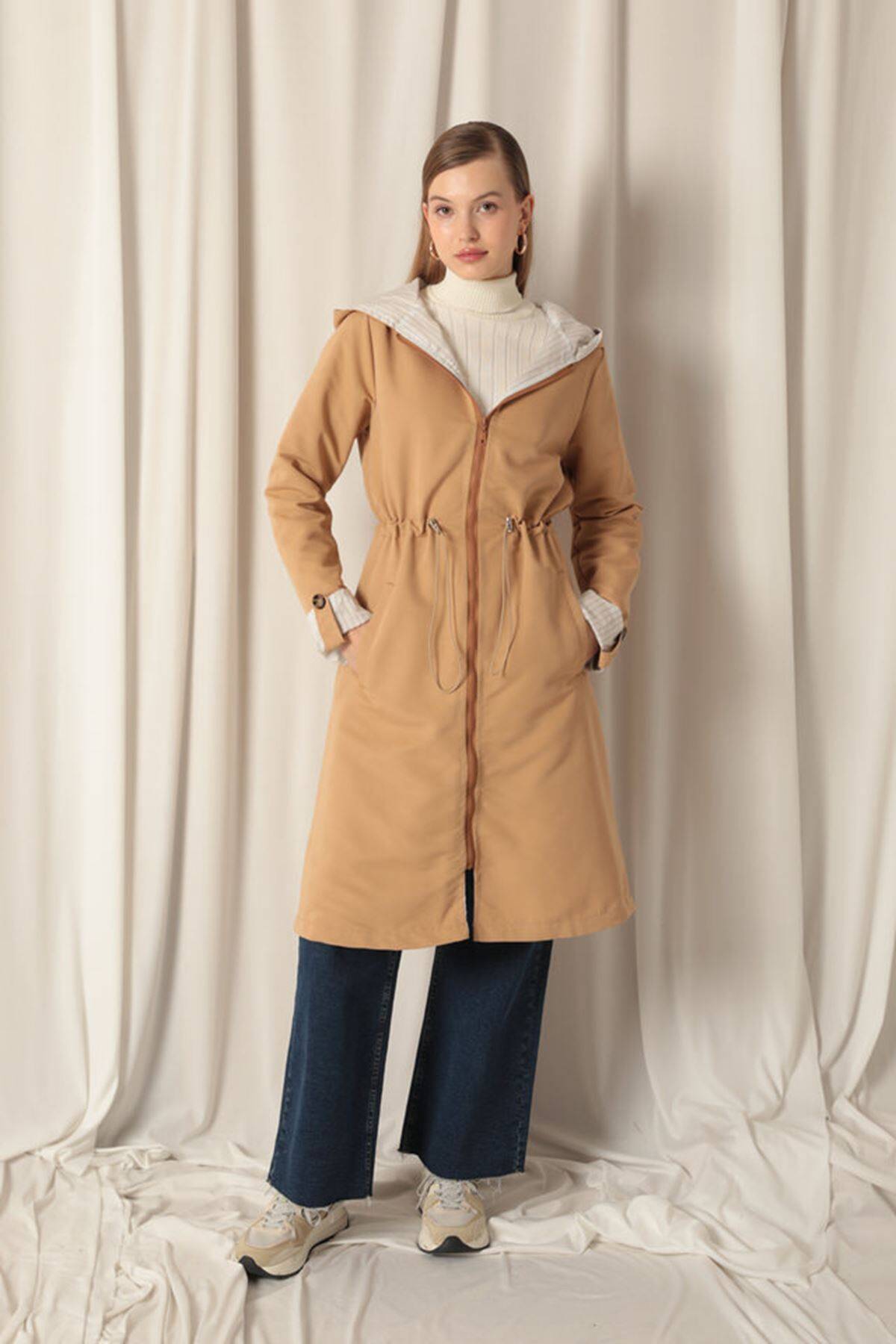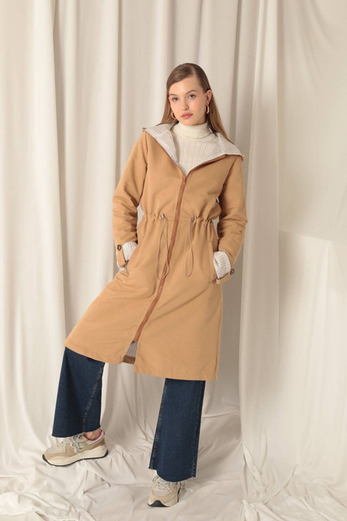 Torino Kumaş Çizgili Garnili Kapüşonlu Kadın Camel Yağmurluk