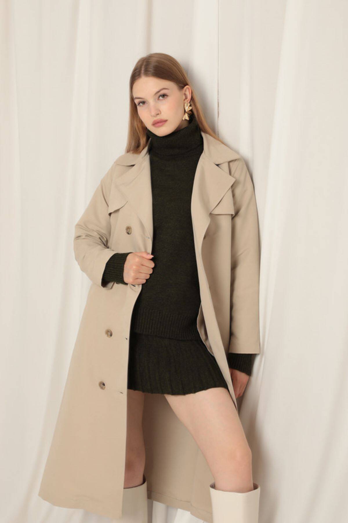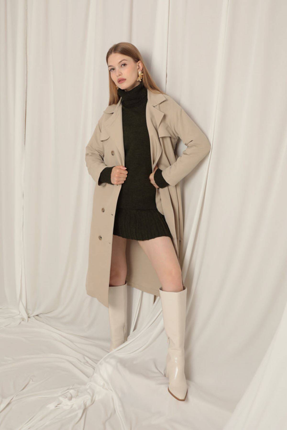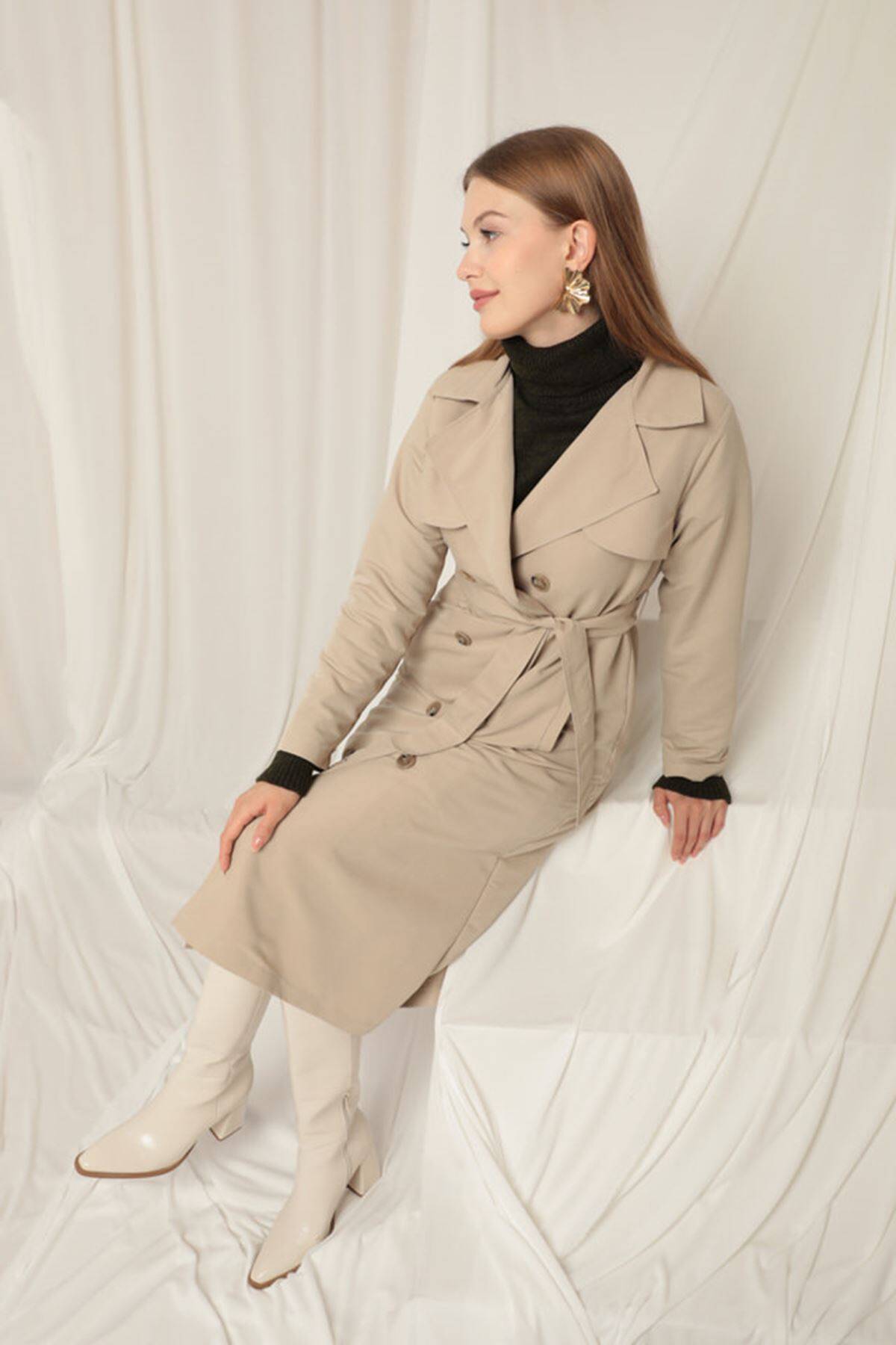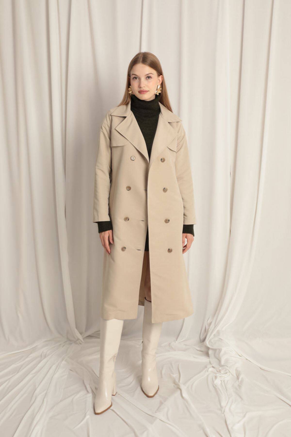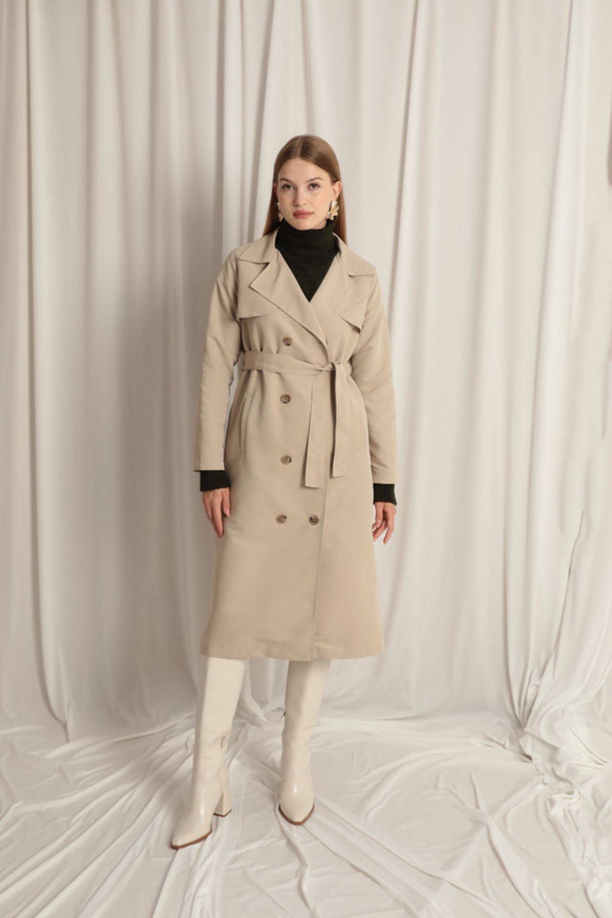 Torino Kumaş Sıvı Geçirmez Maxi Boy Kadın Taş Trençkot