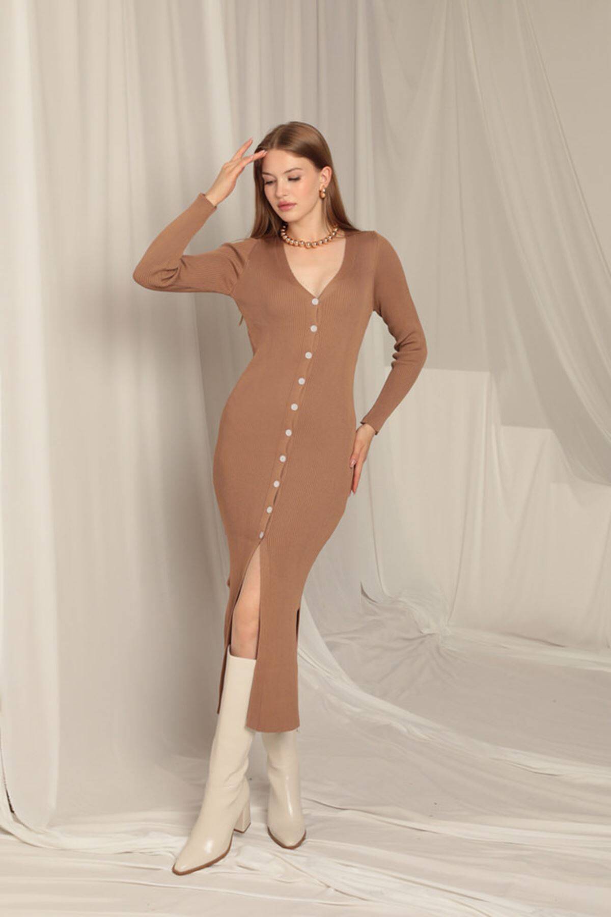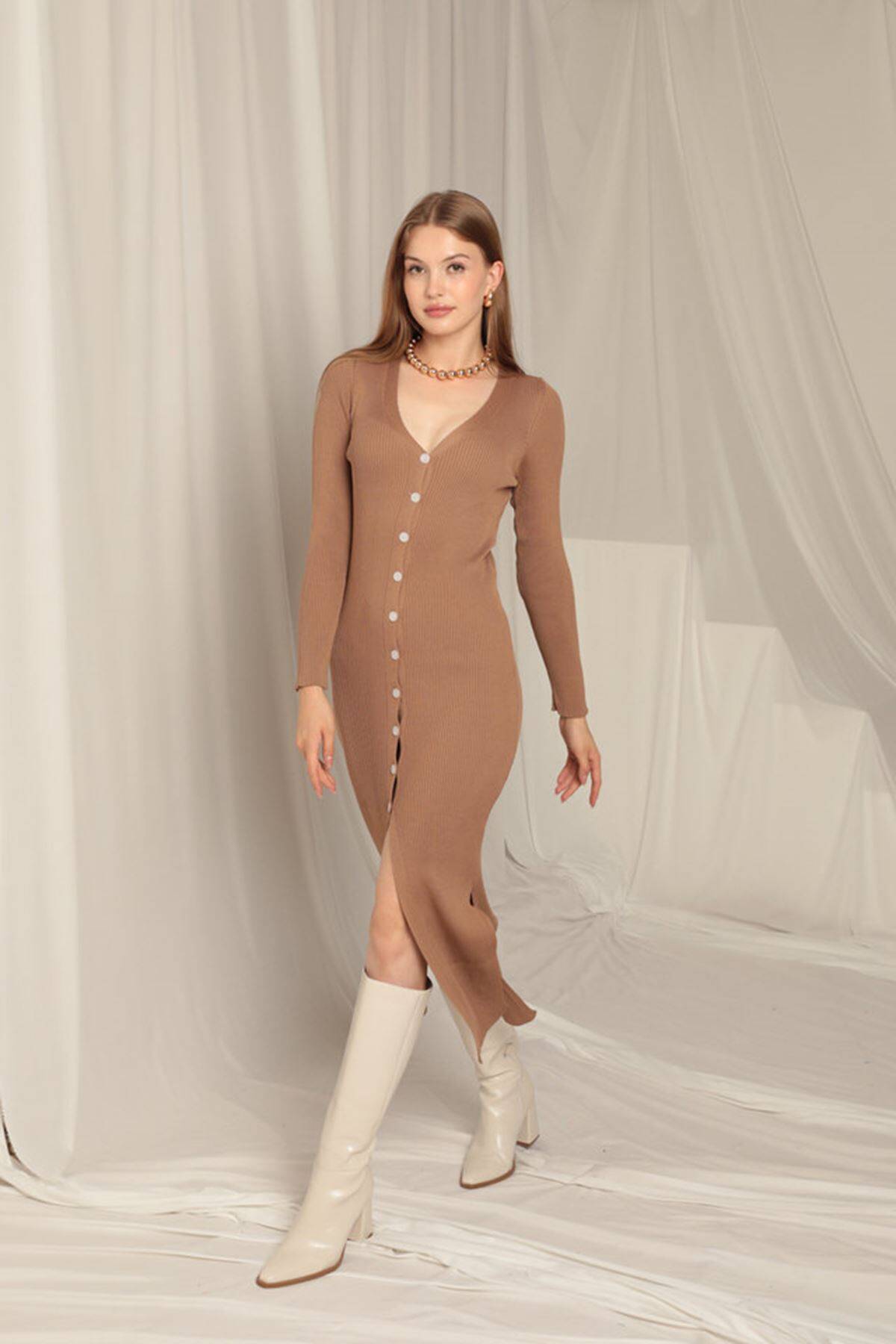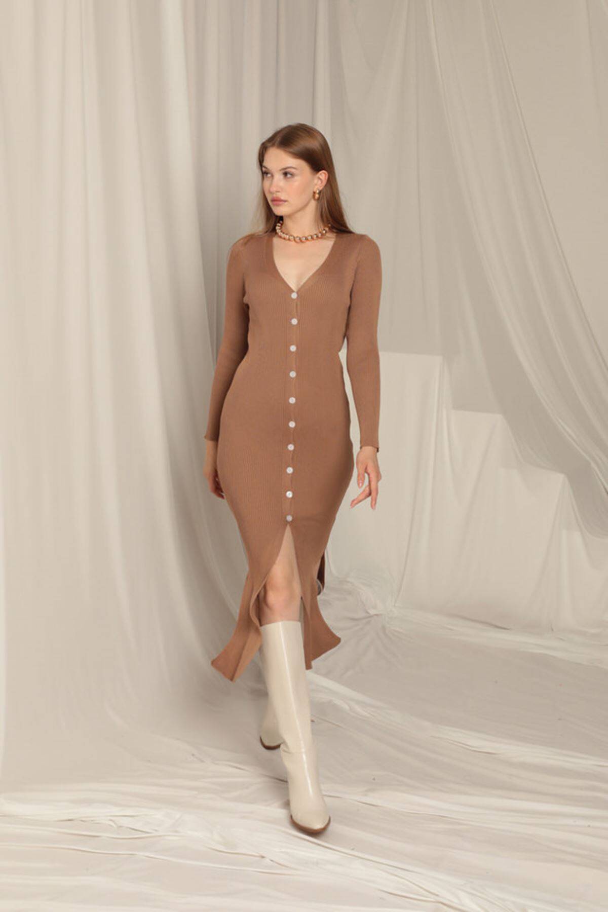 Triko Kumaş Düğmeli Kadın Kahve Elbise