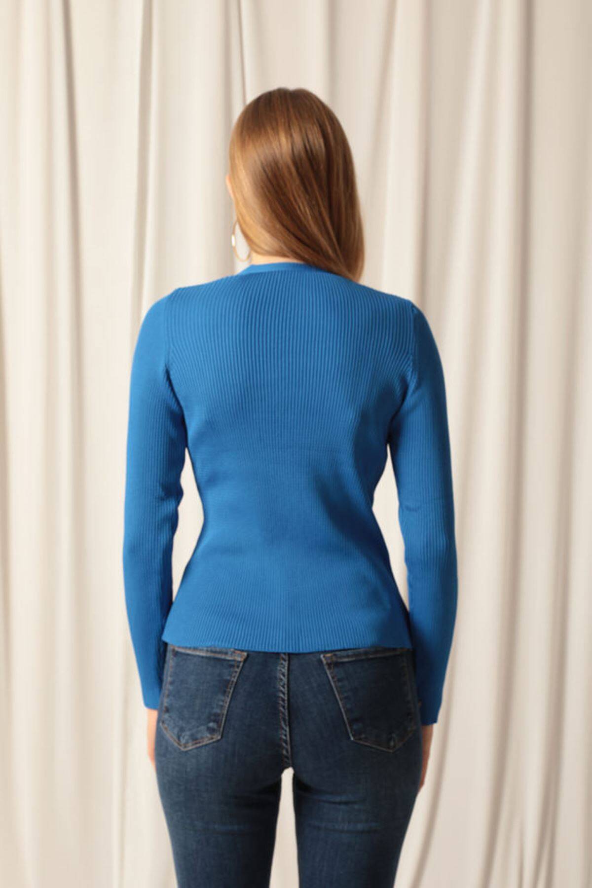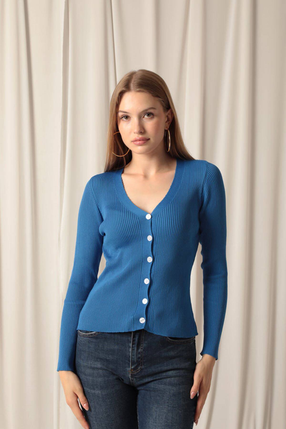 Triko Kumaş Düğmeli Kadın Saks Hırka