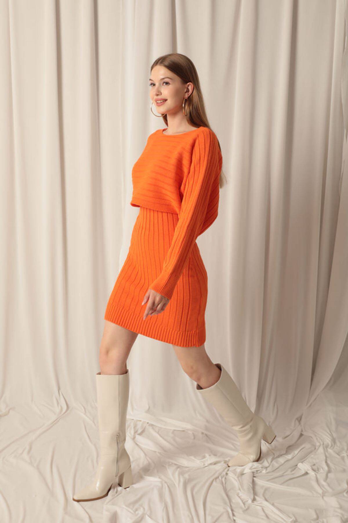 Triko Kumaş Kazaklı Oranj Elbise Takım