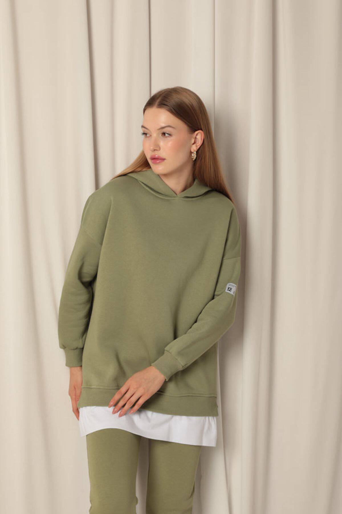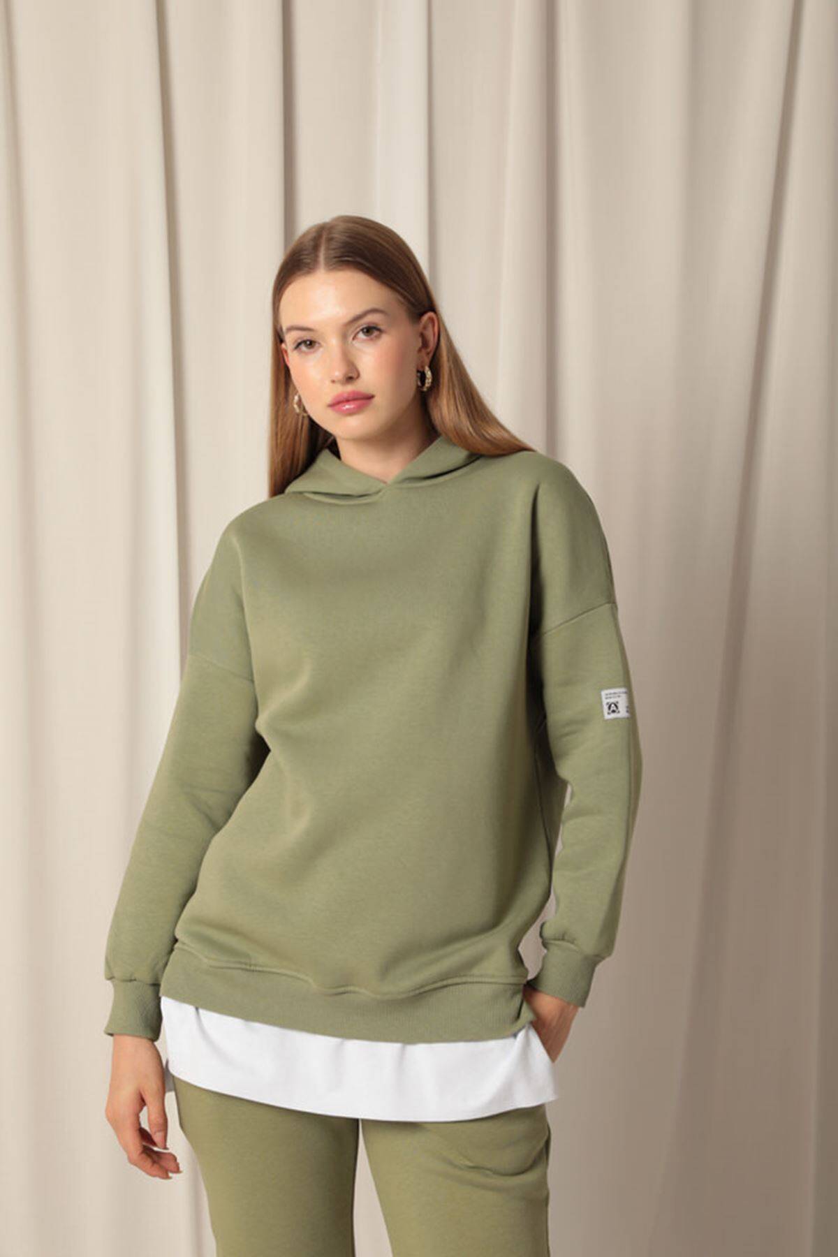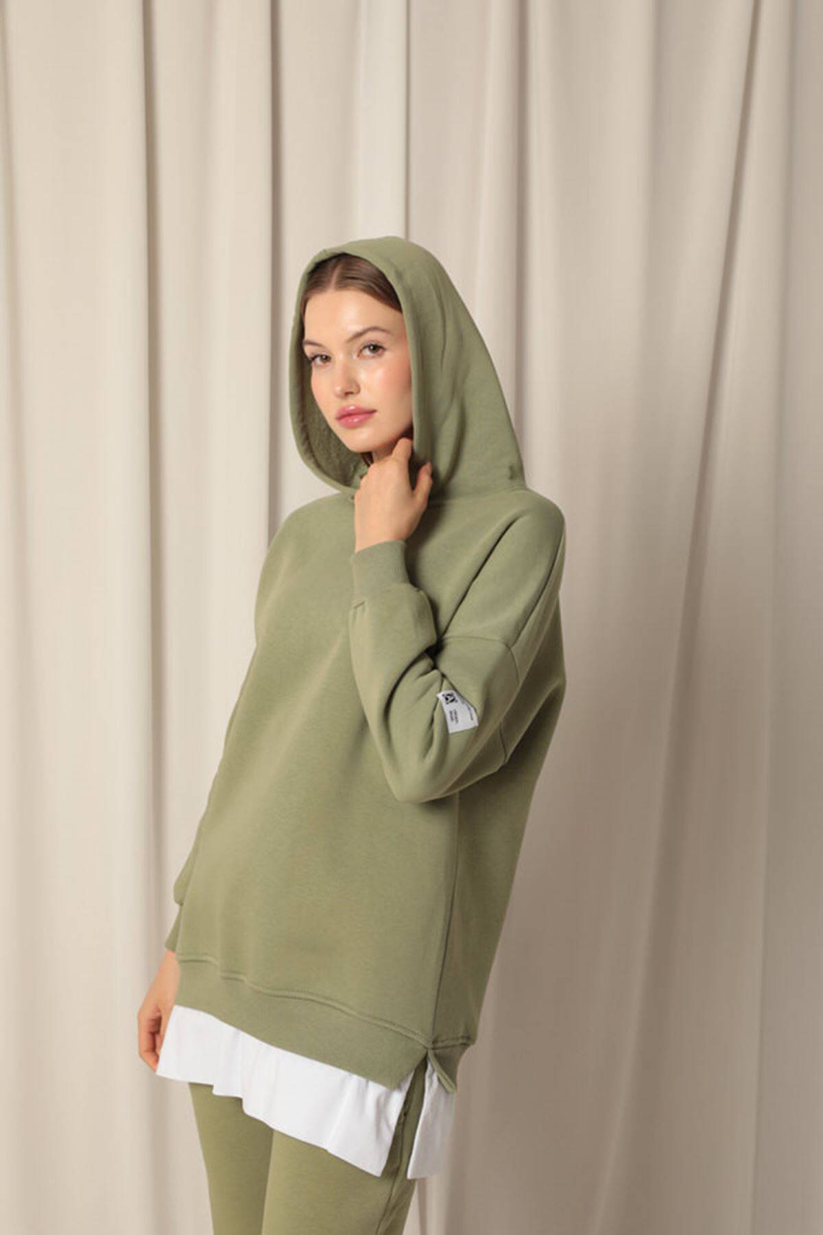Üç İplik Arma Detay Eteği Garnili Kapüşonlu Kadın Haki Sweat