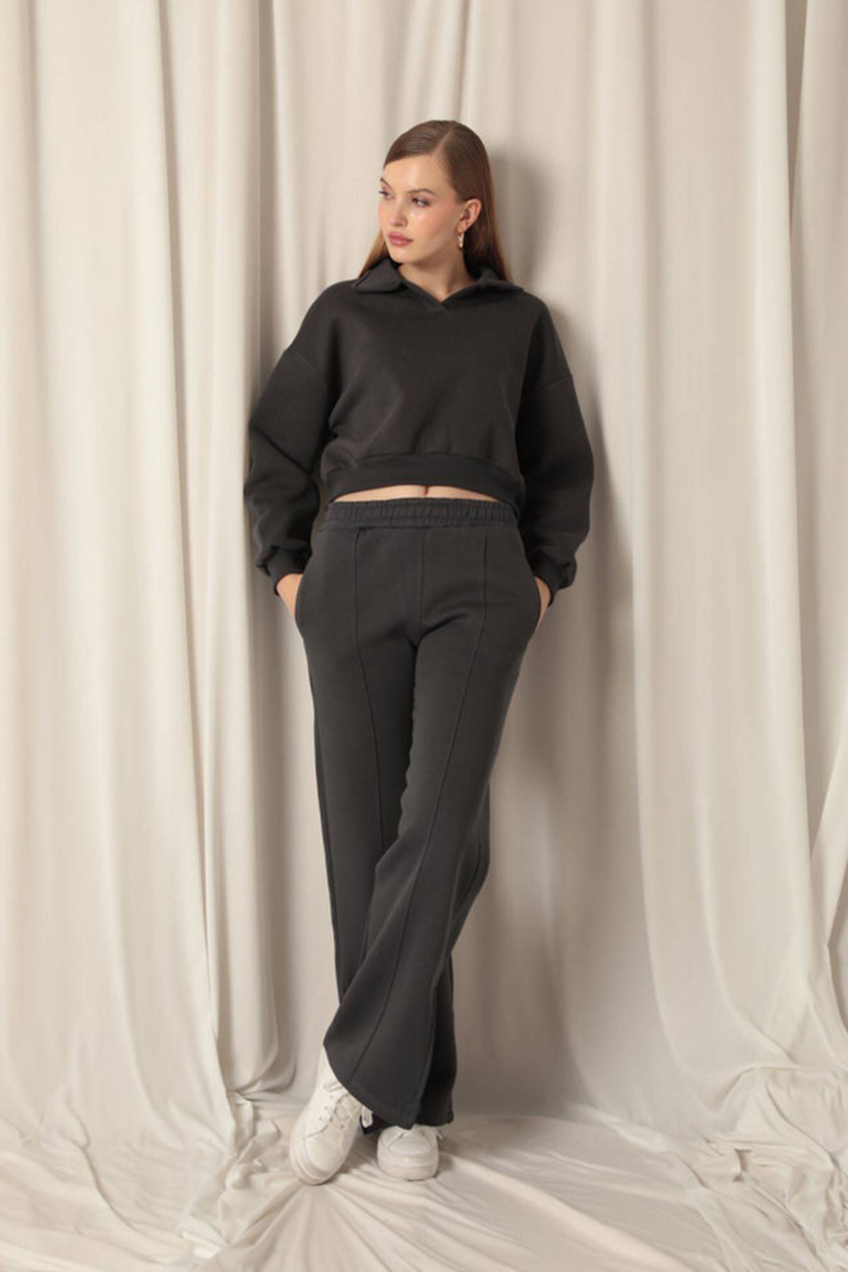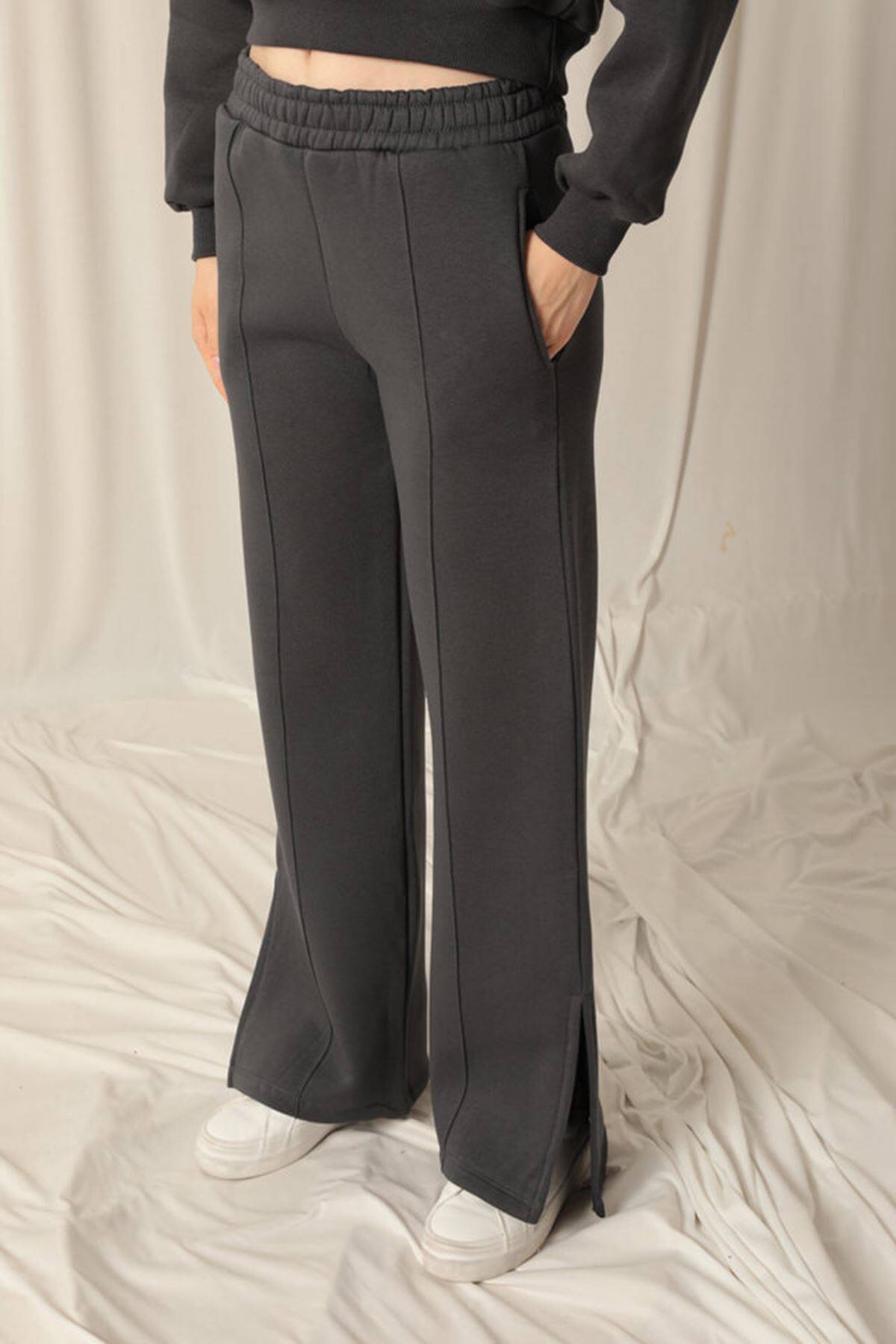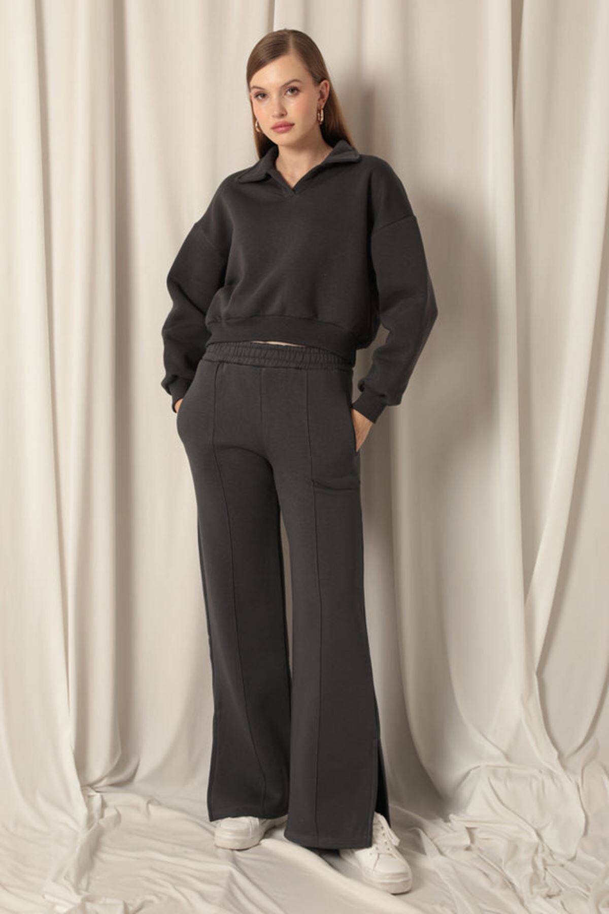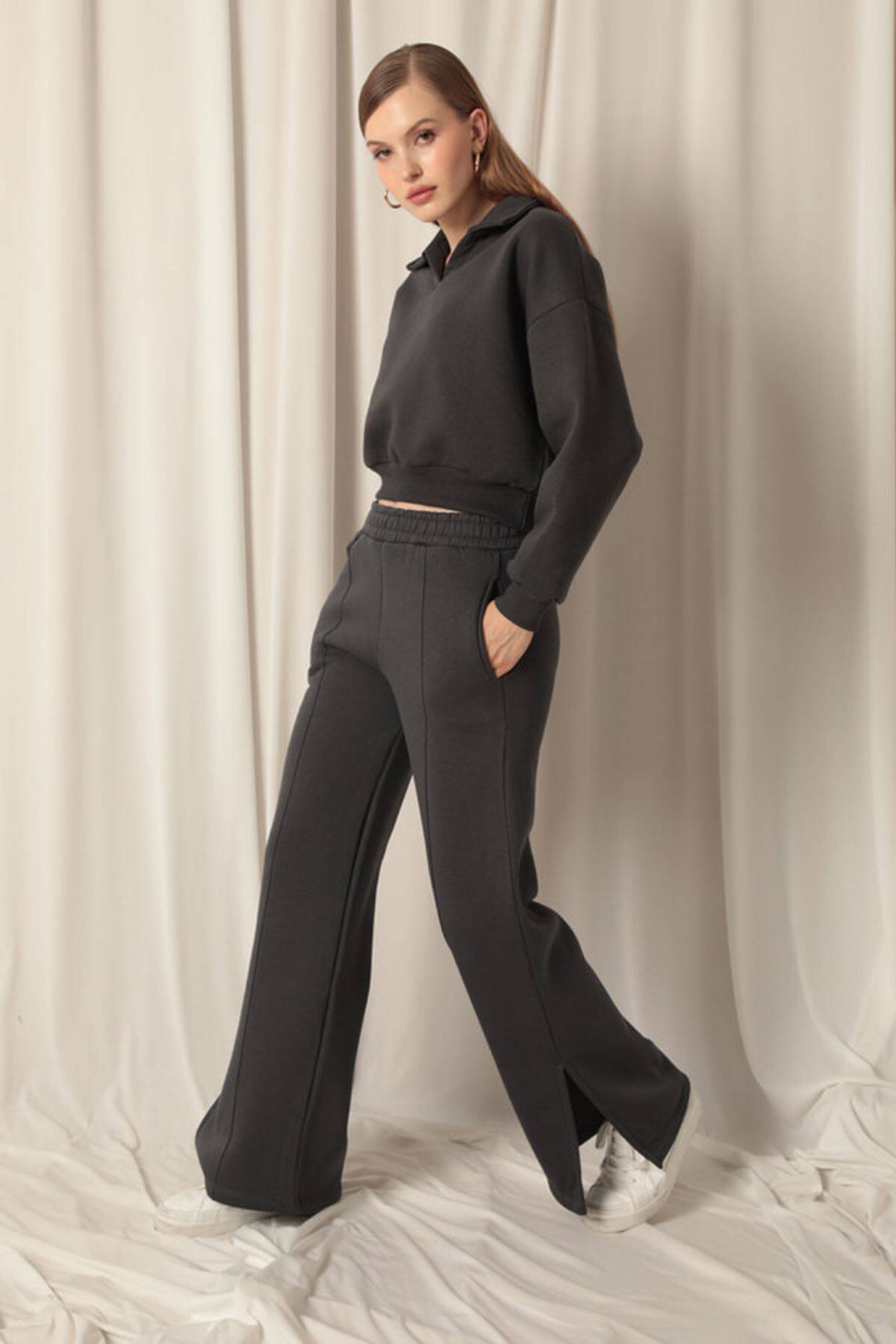 Üç iplik Biyeli Çimalı Yırtmaçlı Bol Paça Kadın Füme Eşofman