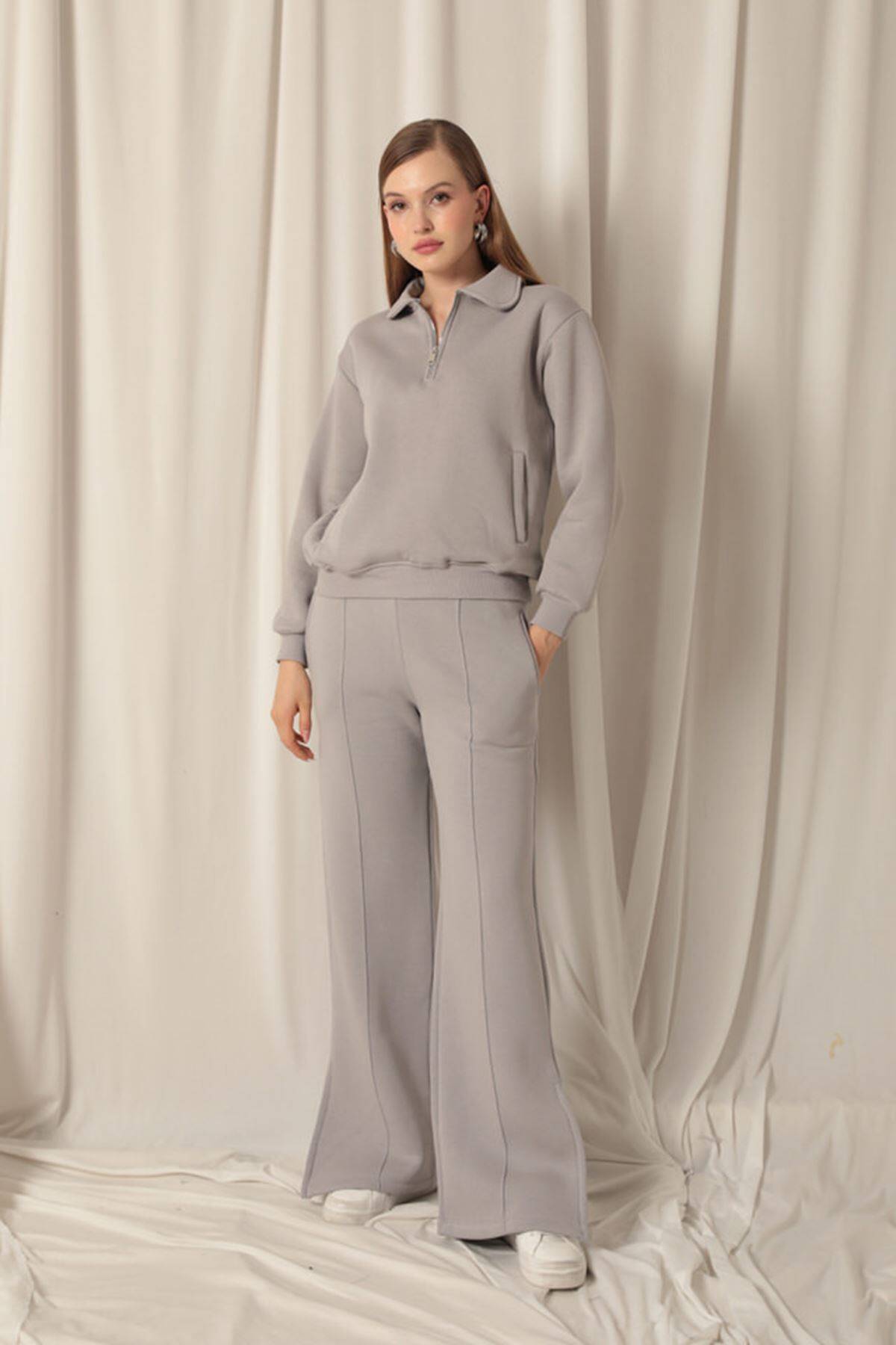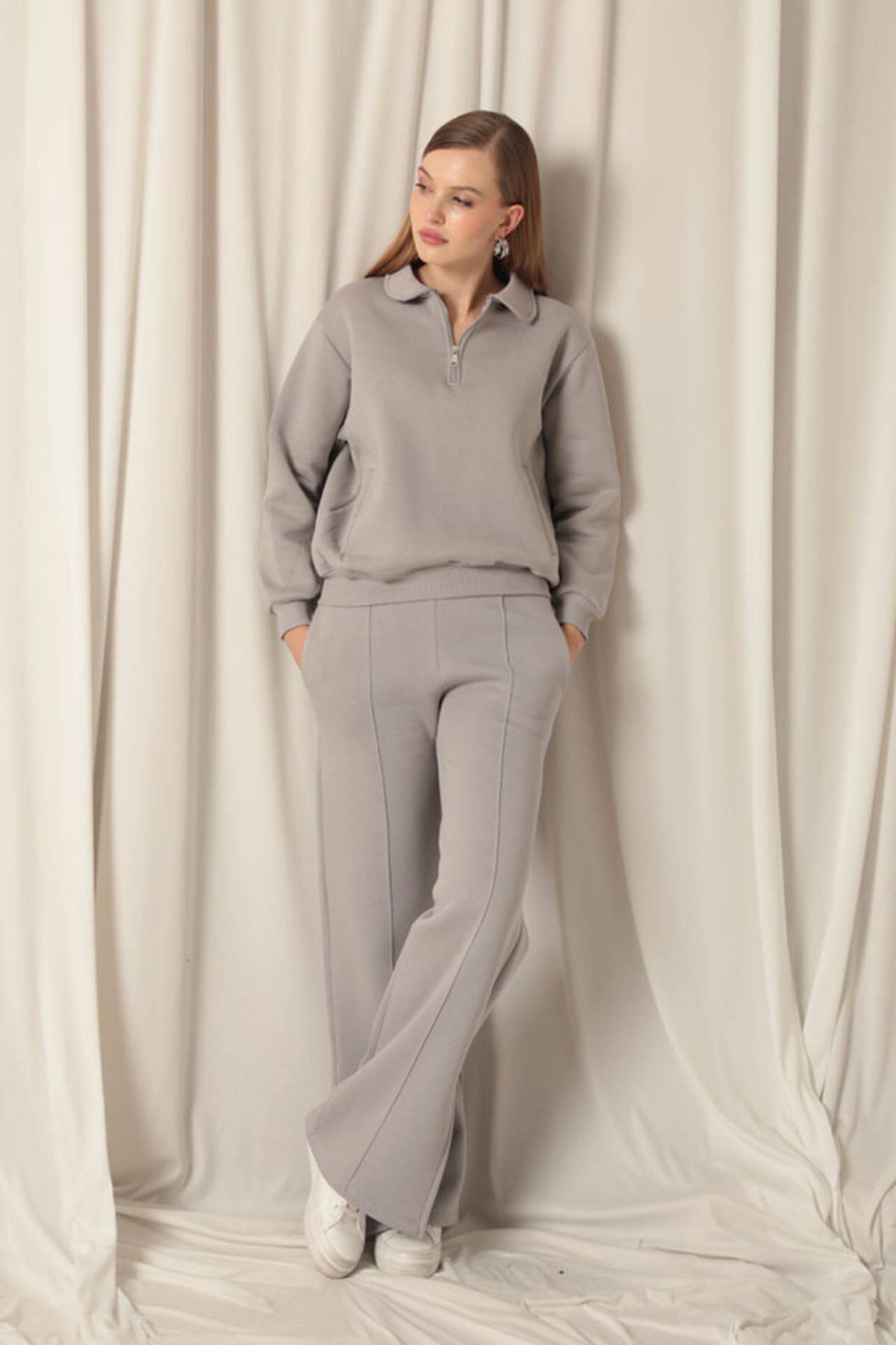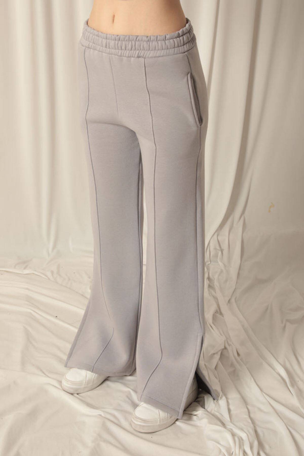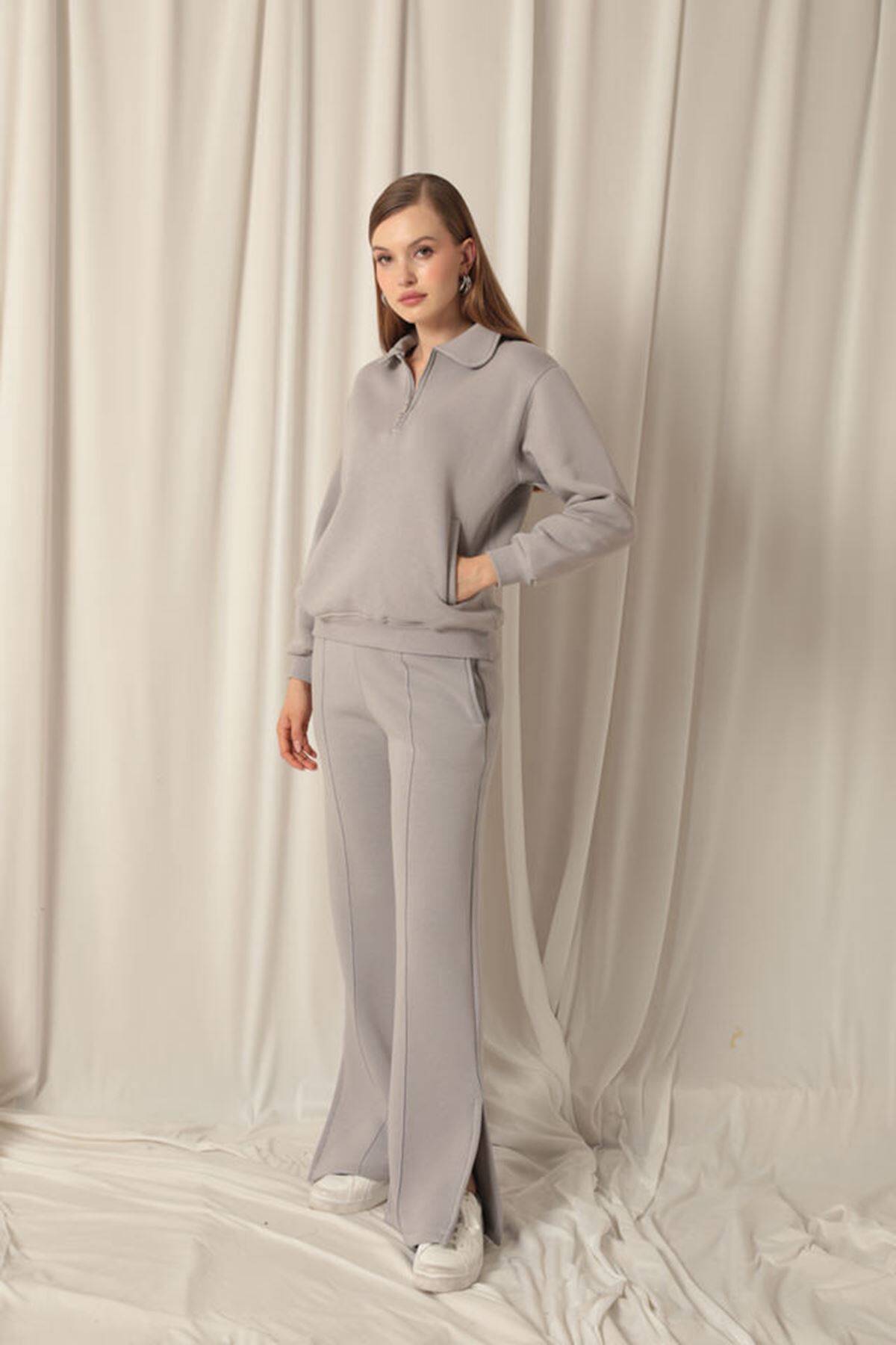 Üç İplik Biyeli Çimalı Yırtmaçlı Bol Paça Kadın Koyu Gri Eşofman