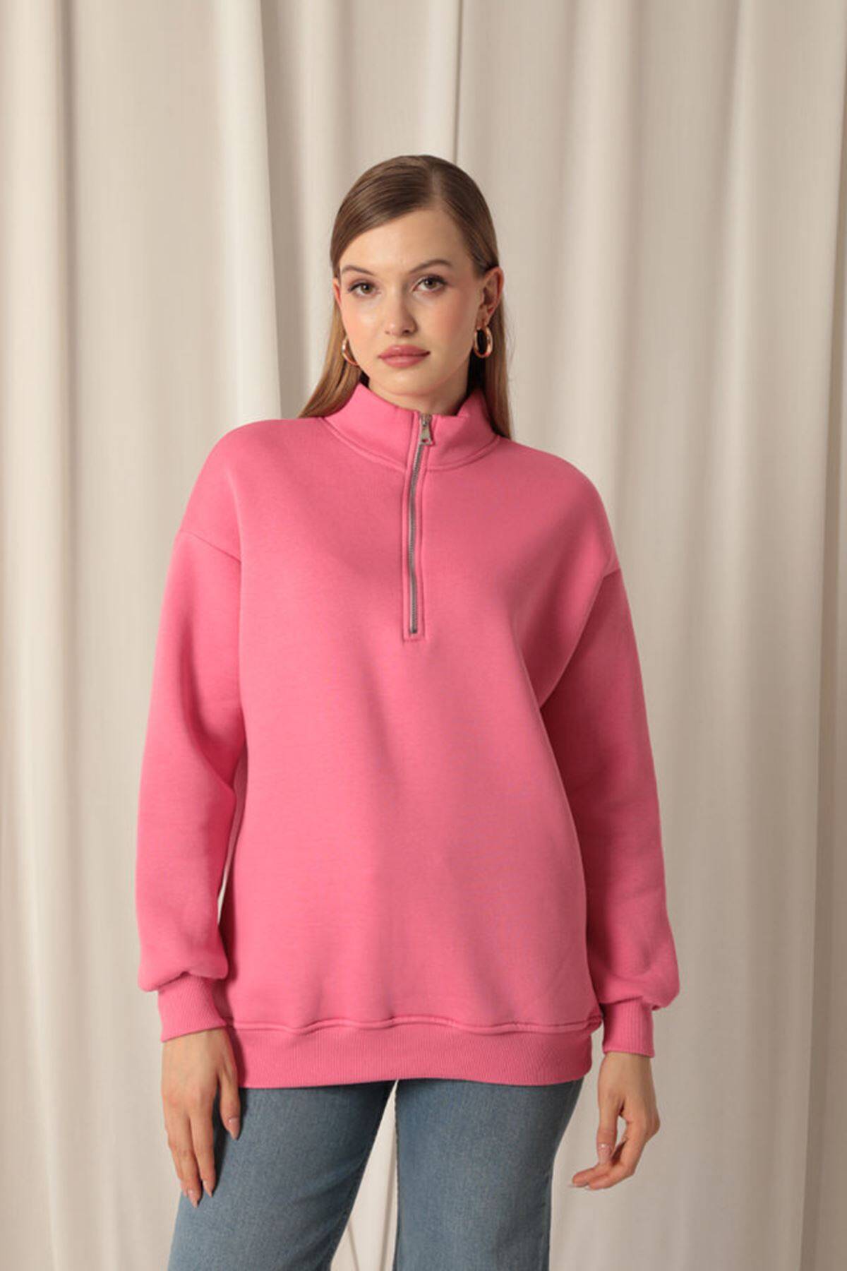 Üç İplik Dik Yaka Yarım Fermuarlı Kadın Pembe Sweat