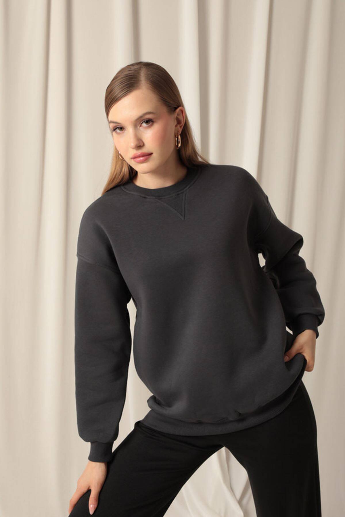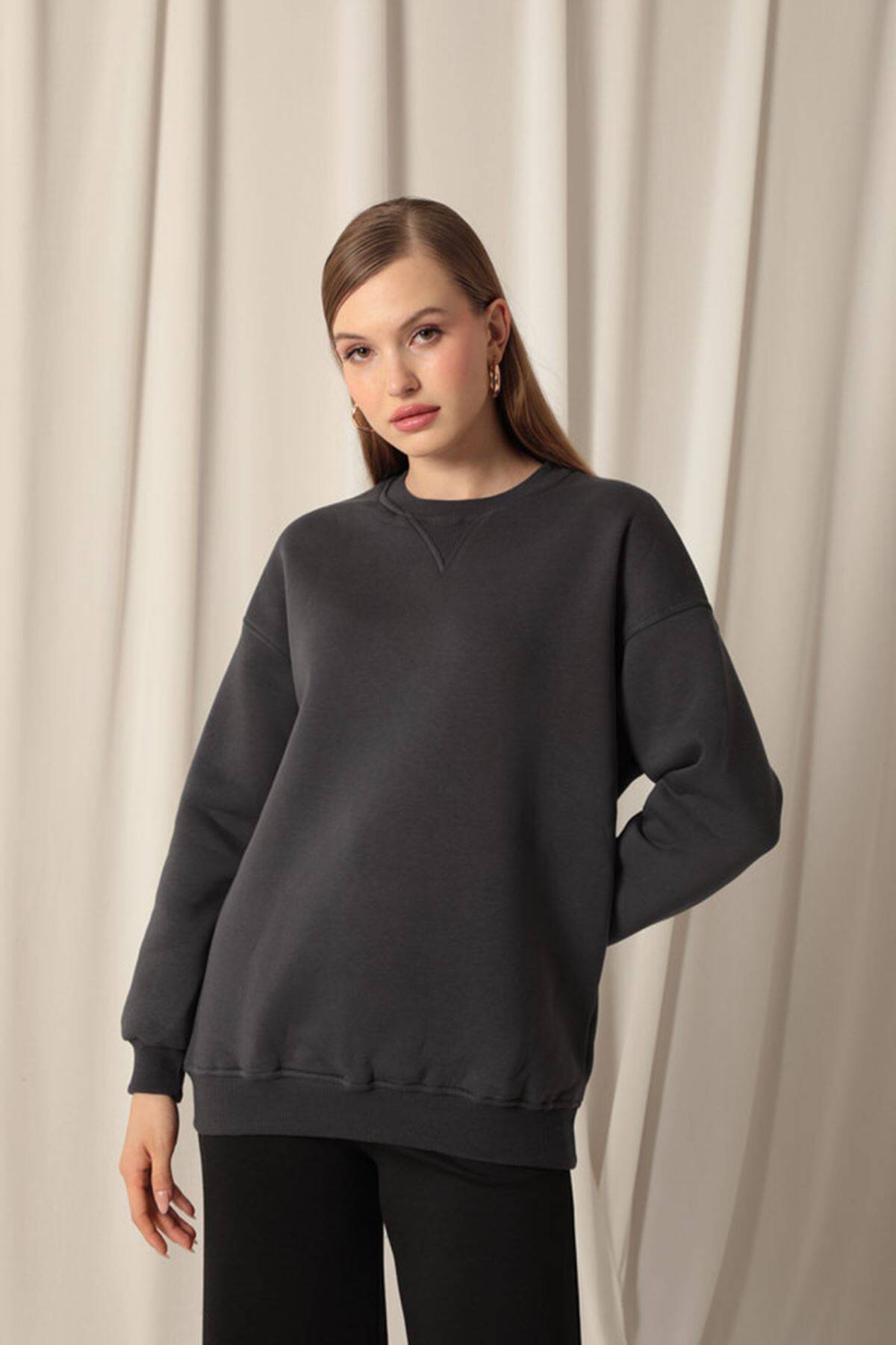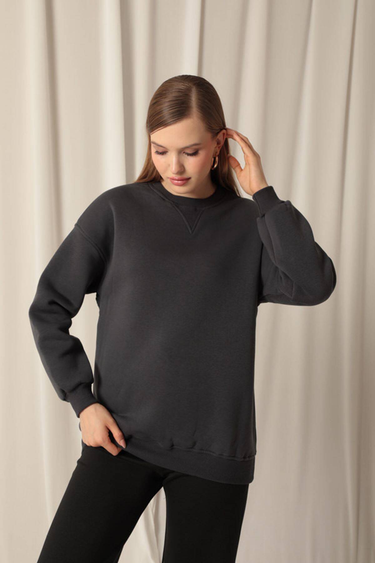Üç İplik Karyokalı Sıfır Yaka Kadın Antrasit Sweat