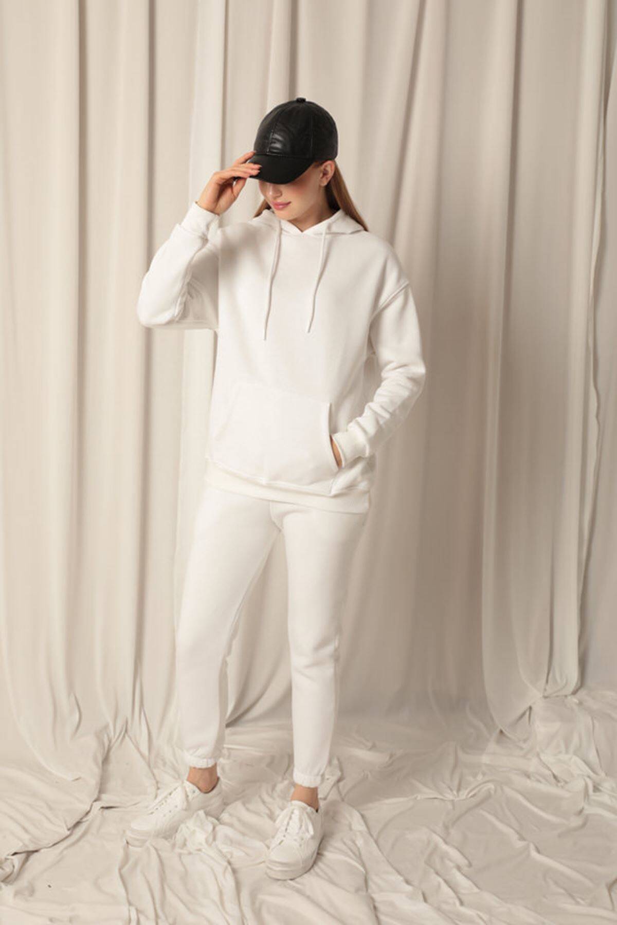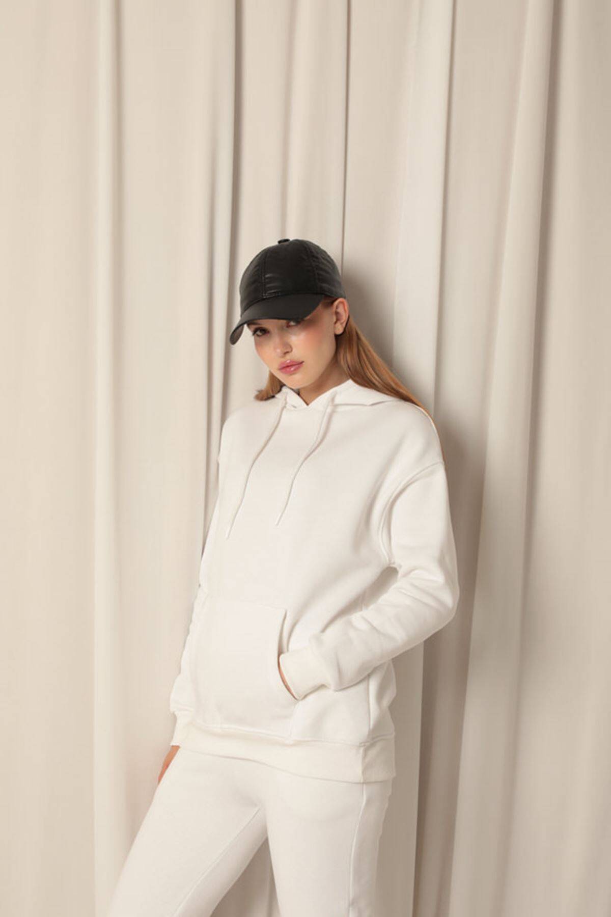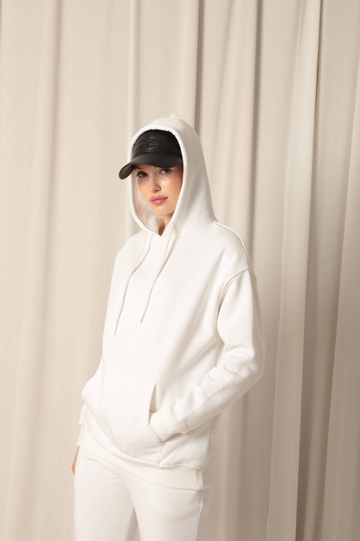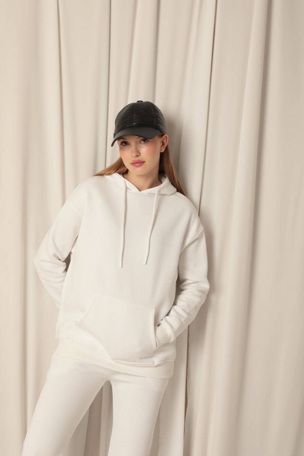 Üç İplik Kumaş Kanguru Cep Kapüşonlu Kadın Ekru Sweat