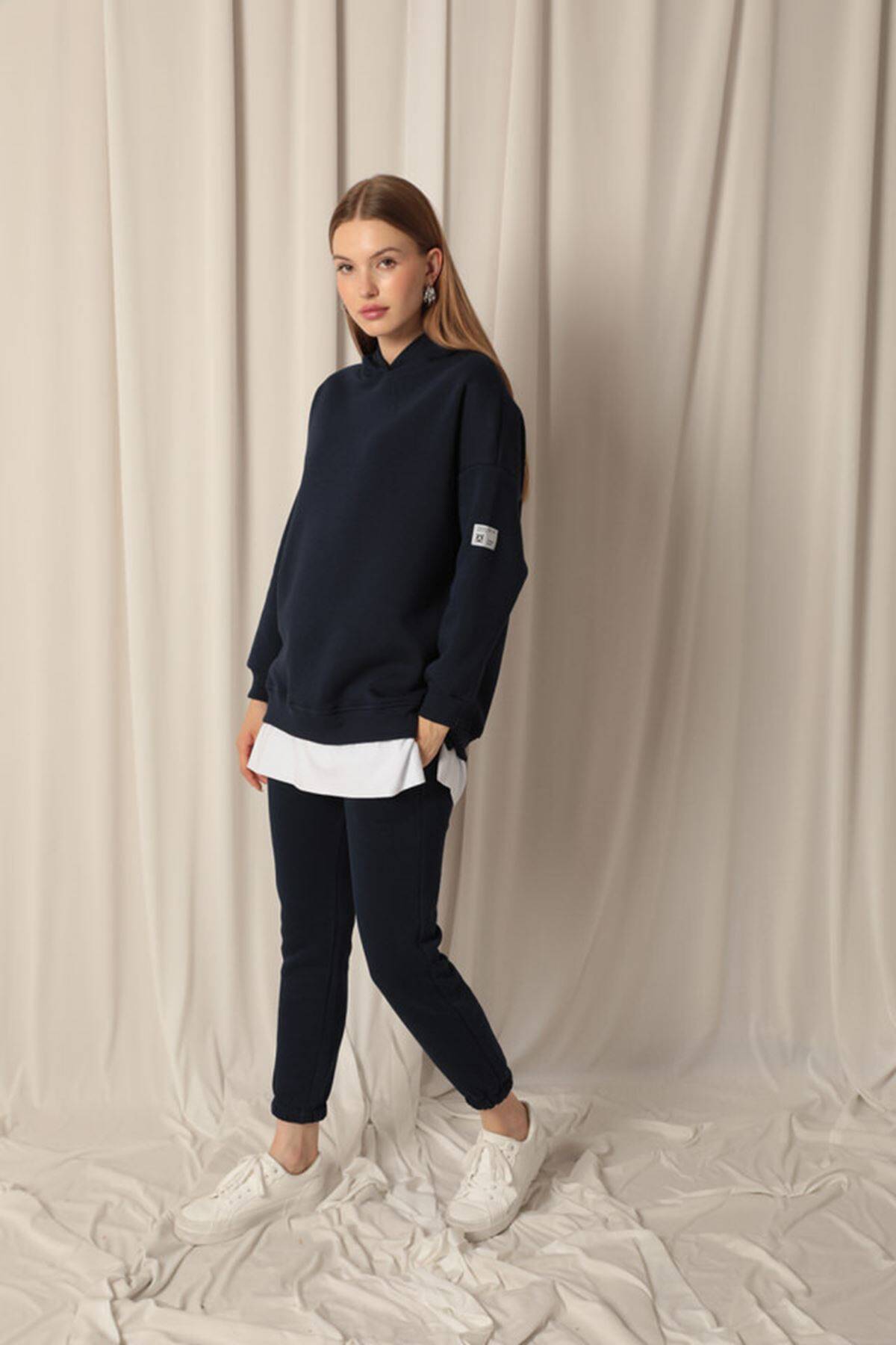 Üç İplik Kumaş Kapüşonlu Kadın Lacivert Sweat