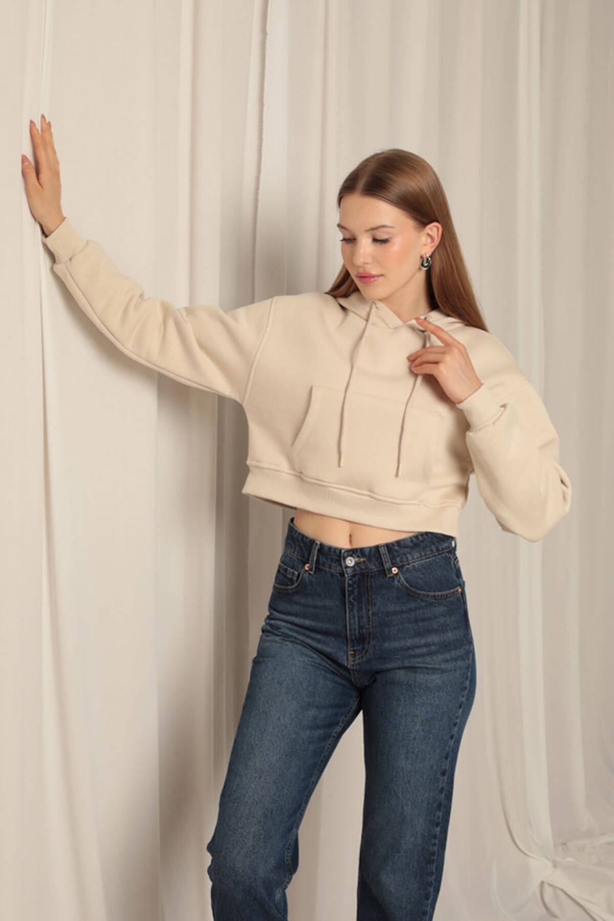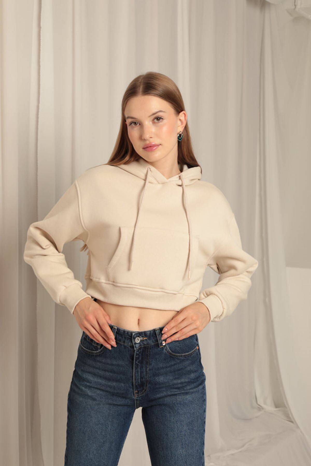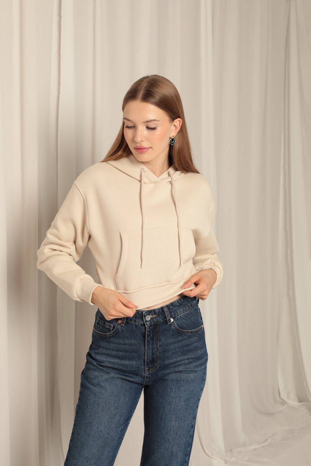 Üç İplik Kumaş Kapüşonlu Kısa Kadın Bej Sweat