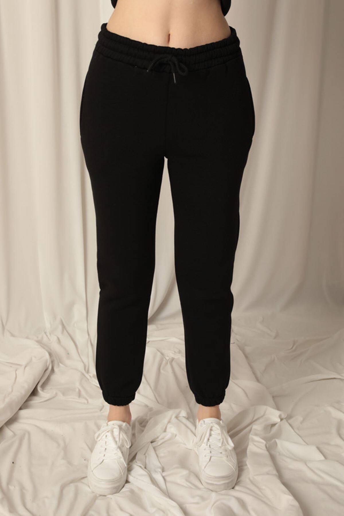 Üç İplik Kumaş Paçası Beli Lastikli Kadın Siyah Eşofman Altı