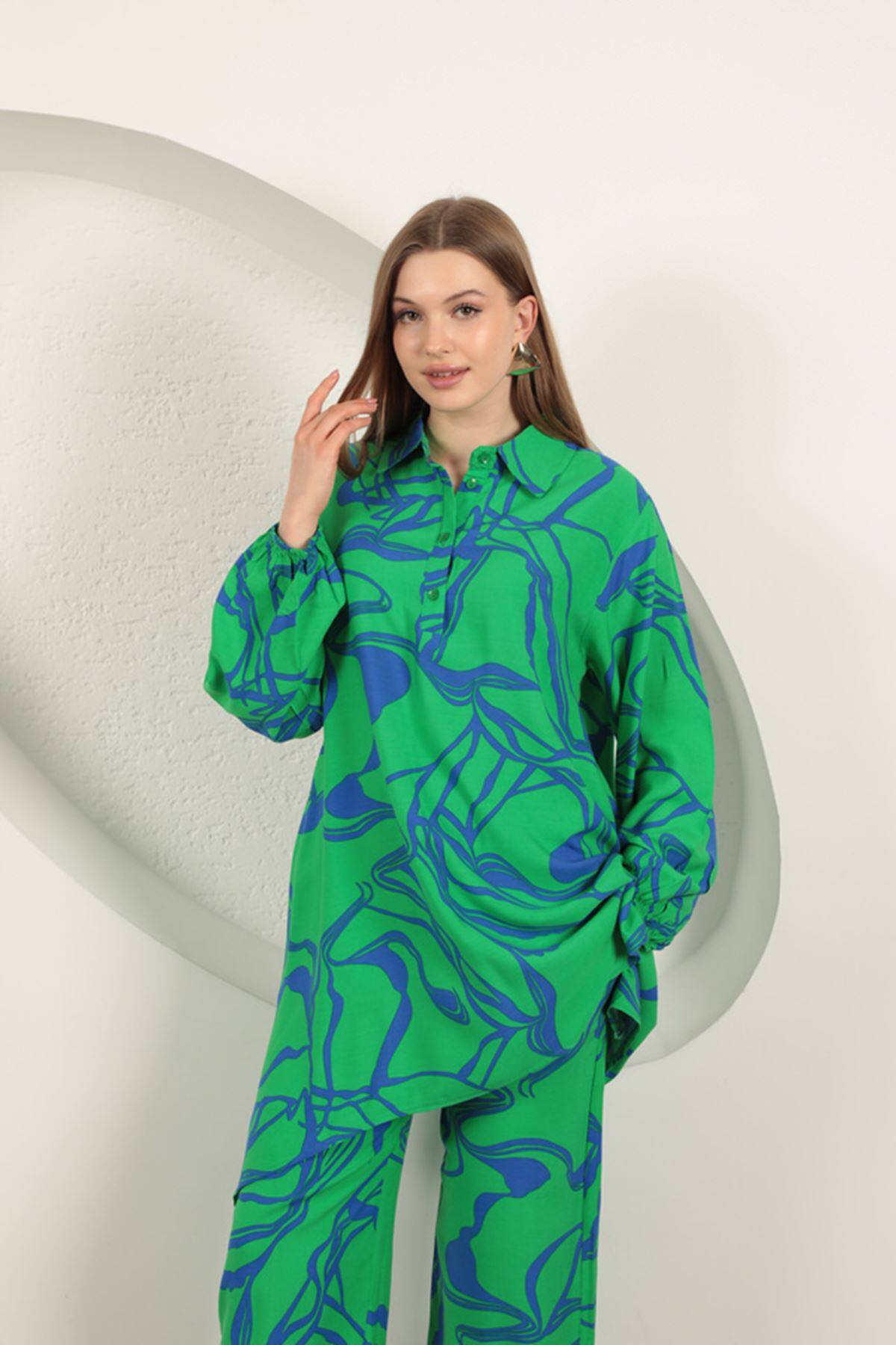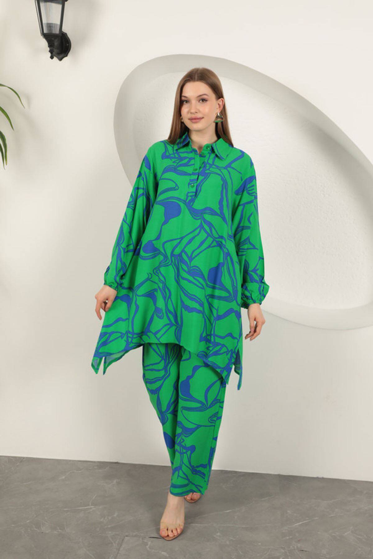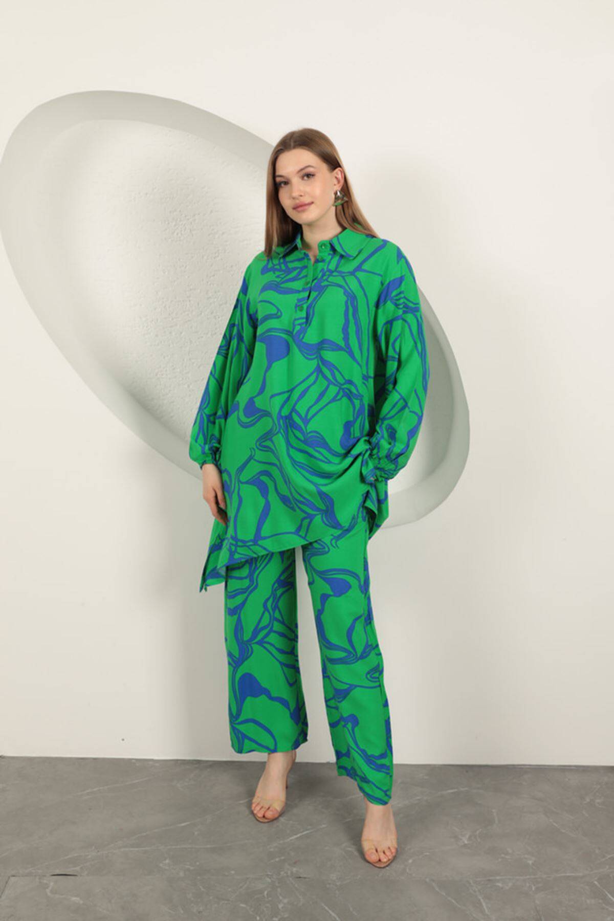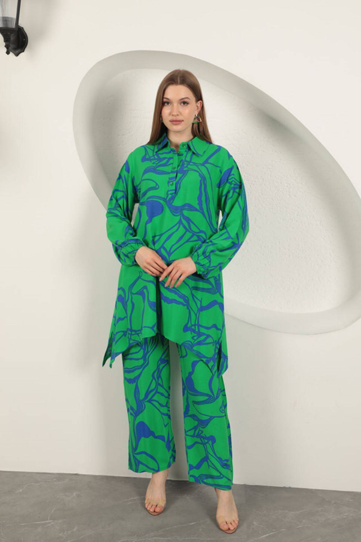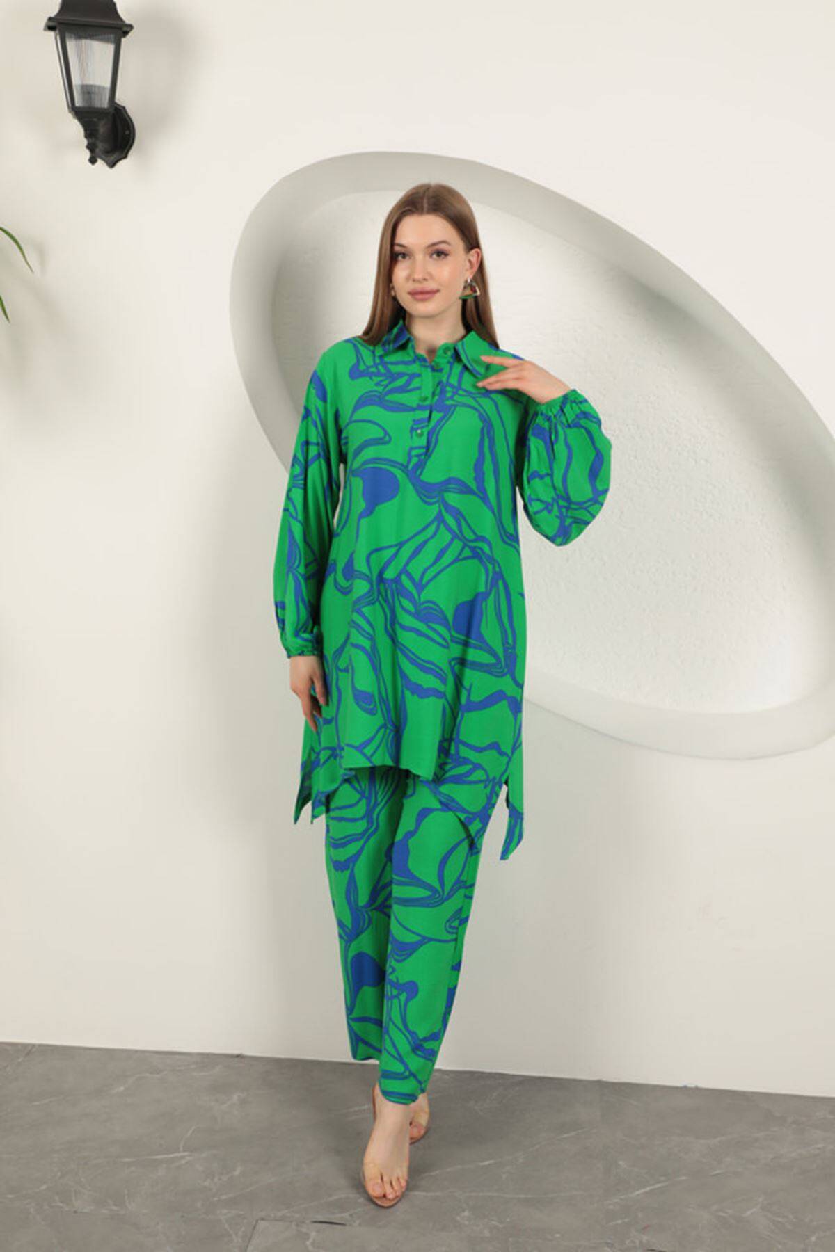 Viskon Desenli Kadın Takım-Yeşil